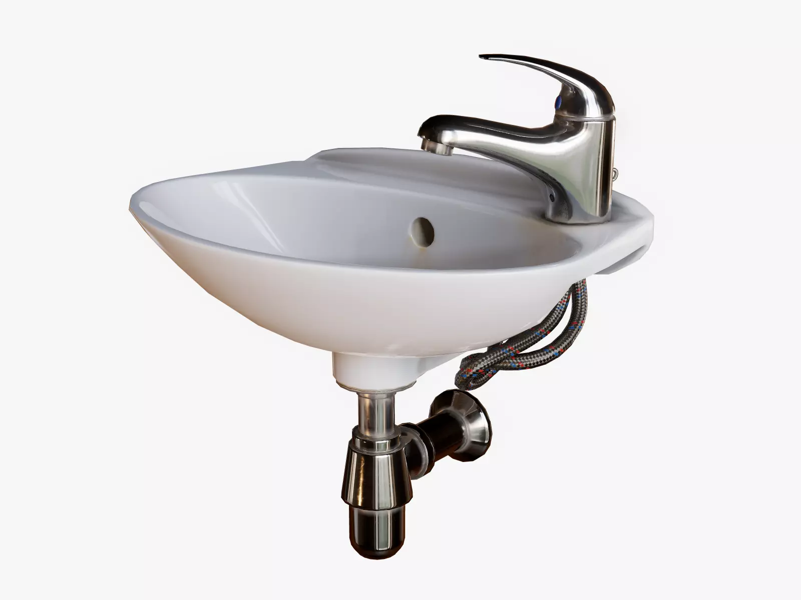 3D model of compact bathroom sink with faucet. Model is low-poly with PBR textures.