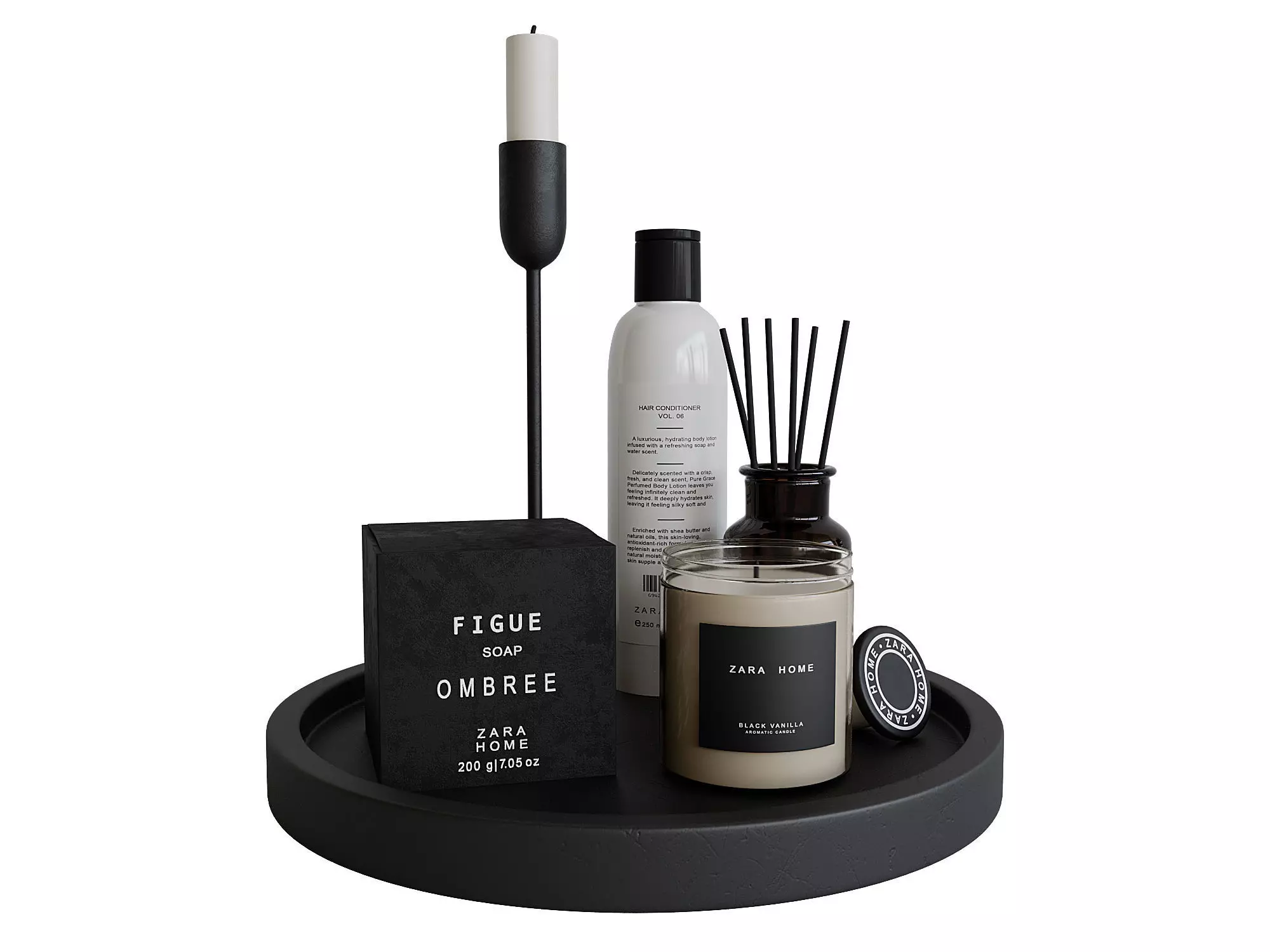• Decorative set for bathroom and bathroom, with a plate, shampoo, soap, decorative candles and Zara Home incense sticks