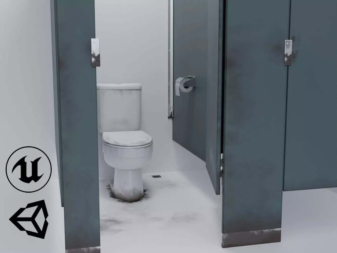 A dirty bathroom stall for game engines. Made out of a modular set of objects.