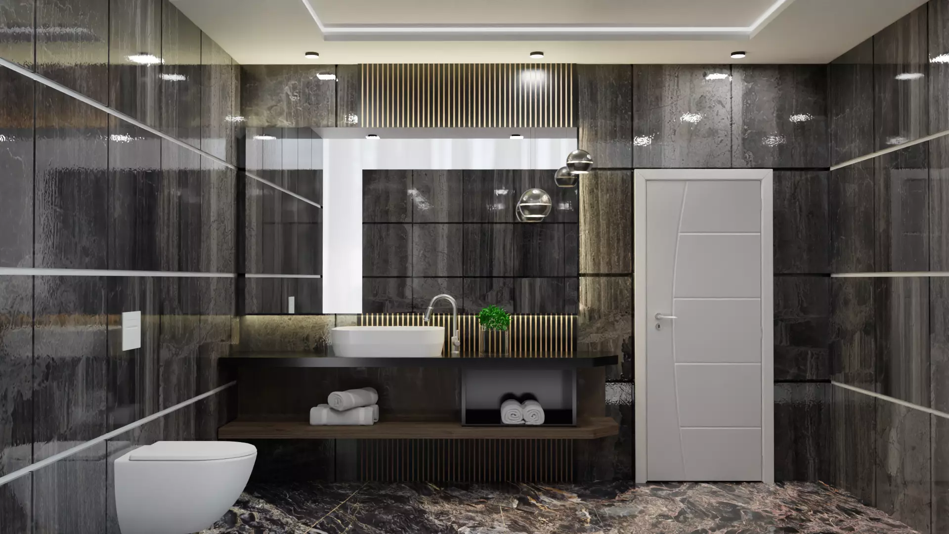Design Elements:The bathroom's aesthetic revolves around clean lines, smooth surfaces, and a harmonious blend of contrasting materials. Sleek, high-gloss porcelain tiles adorn the walls and floor, creating a seamless visual continuity that complements the stunning polished marble countertop on the vanity.