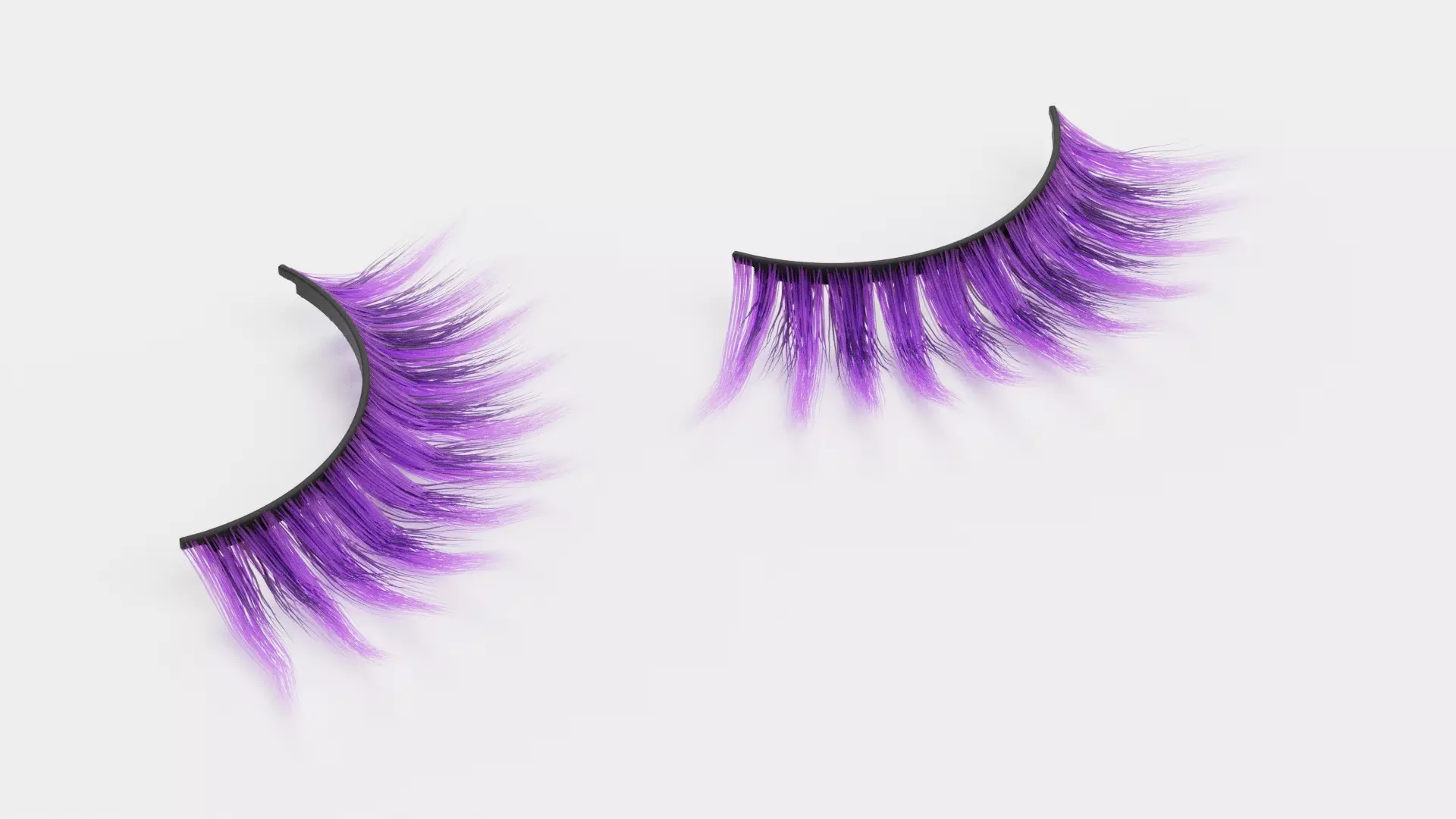 A set of colored false eyelashes with a violet tone, arranged on a subtle base strip to maintain natural curvature. The variation in hair density and length adds visual interest while preserving realistic lash structure. Clean, unbranded surfaces make this accessory suitable for makeup displays, cosmetic mockups, or creative eye-focused product visualization.