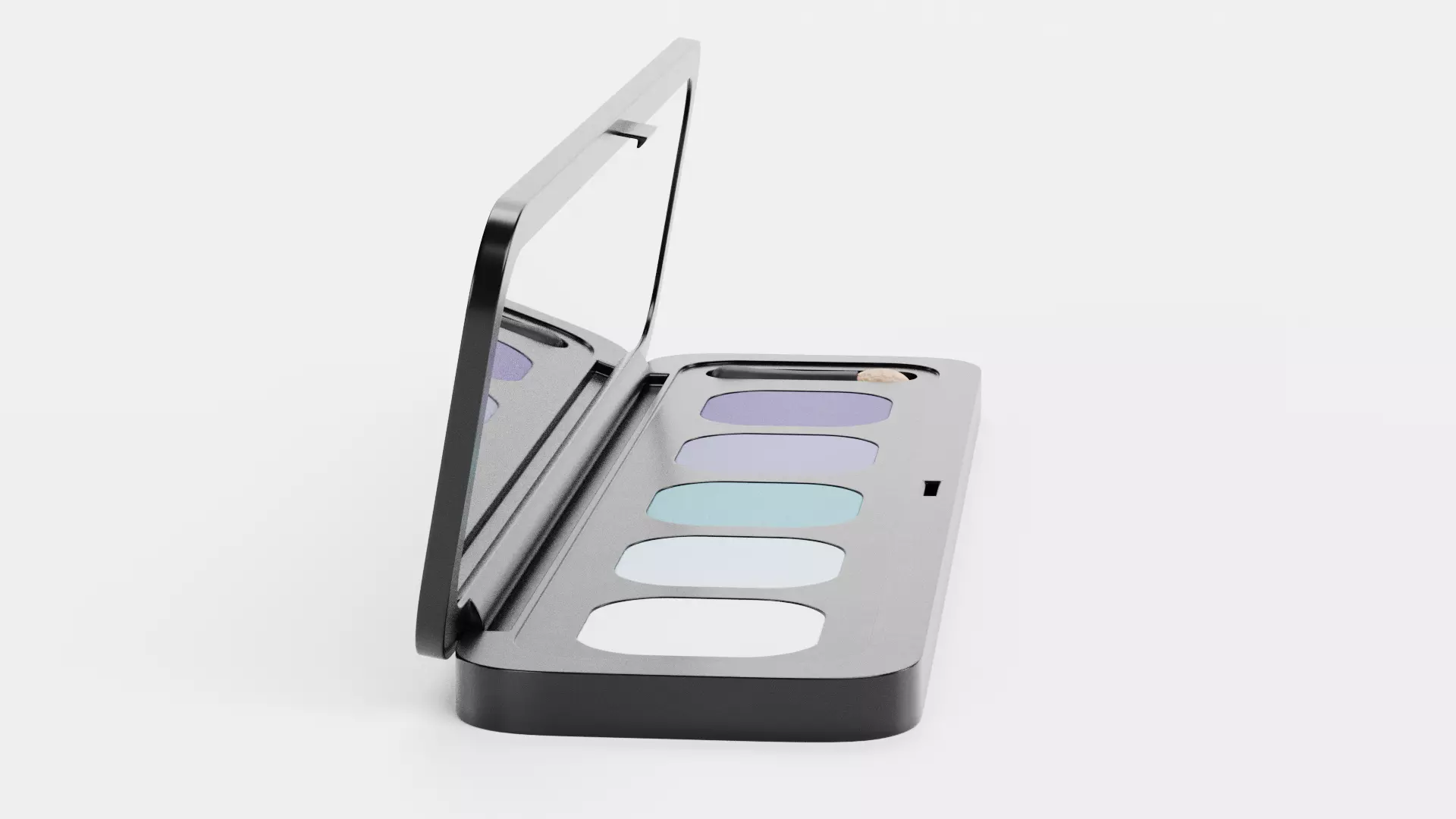 A slim eyeshadow palette developed as a brand-neutral cosmetic packaging asset with a linear shade arrangement. The five tones transition from light neutrals into blue and violet, forming a controlled gradient concept suitable for modern makeup collections. The elongated black compact includes an integrated mirror and a single-ended applicator, supporting realistic retail presentation and flexible custom branding.