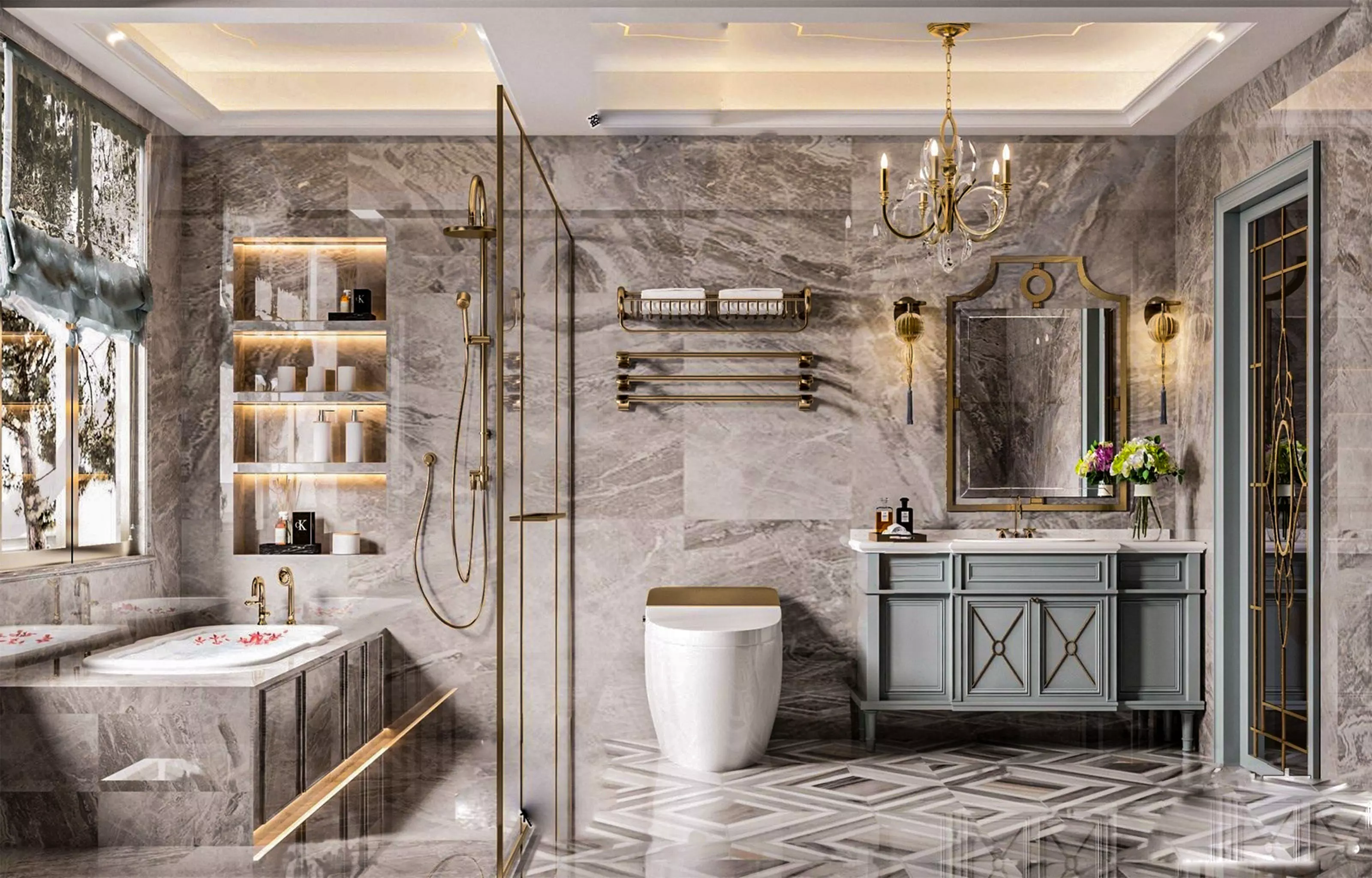 Material and Color Palette:Marble: The walls and floors are adorned with marble, creating a rich and sophisticated atmosphere. The use of a grey and white color scheme adds to the elegant feel.Gold Accents: The fixtures, including the shower head, towel rack, and chandelier, are in gold, providing a touch of opulence.Lighting: