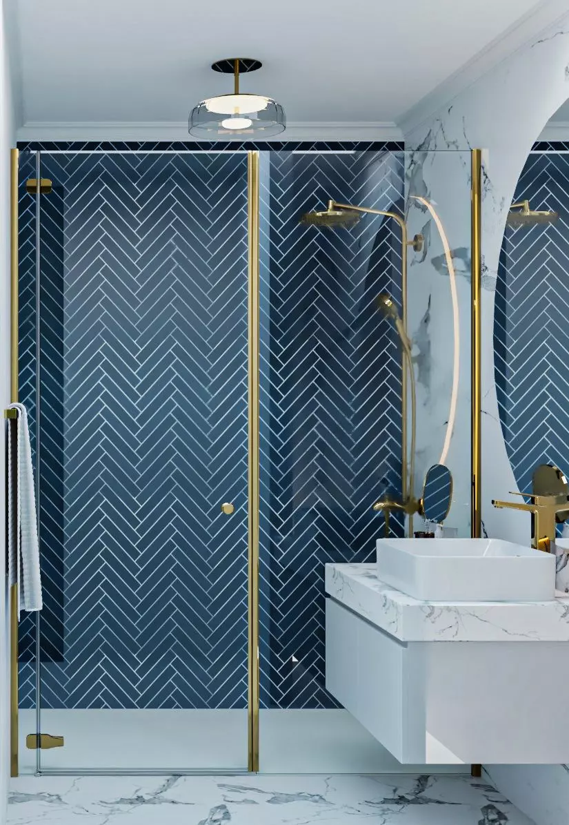 A stylish, modern bathroom designed with a clean and refined aesthetic. The space includes neutral wall tiles, a floating vanity with a vessel sink, and a frameless glass shower. Soft ambient lighting and minimal black fixtures give the room a sophisticated, calming vibe.