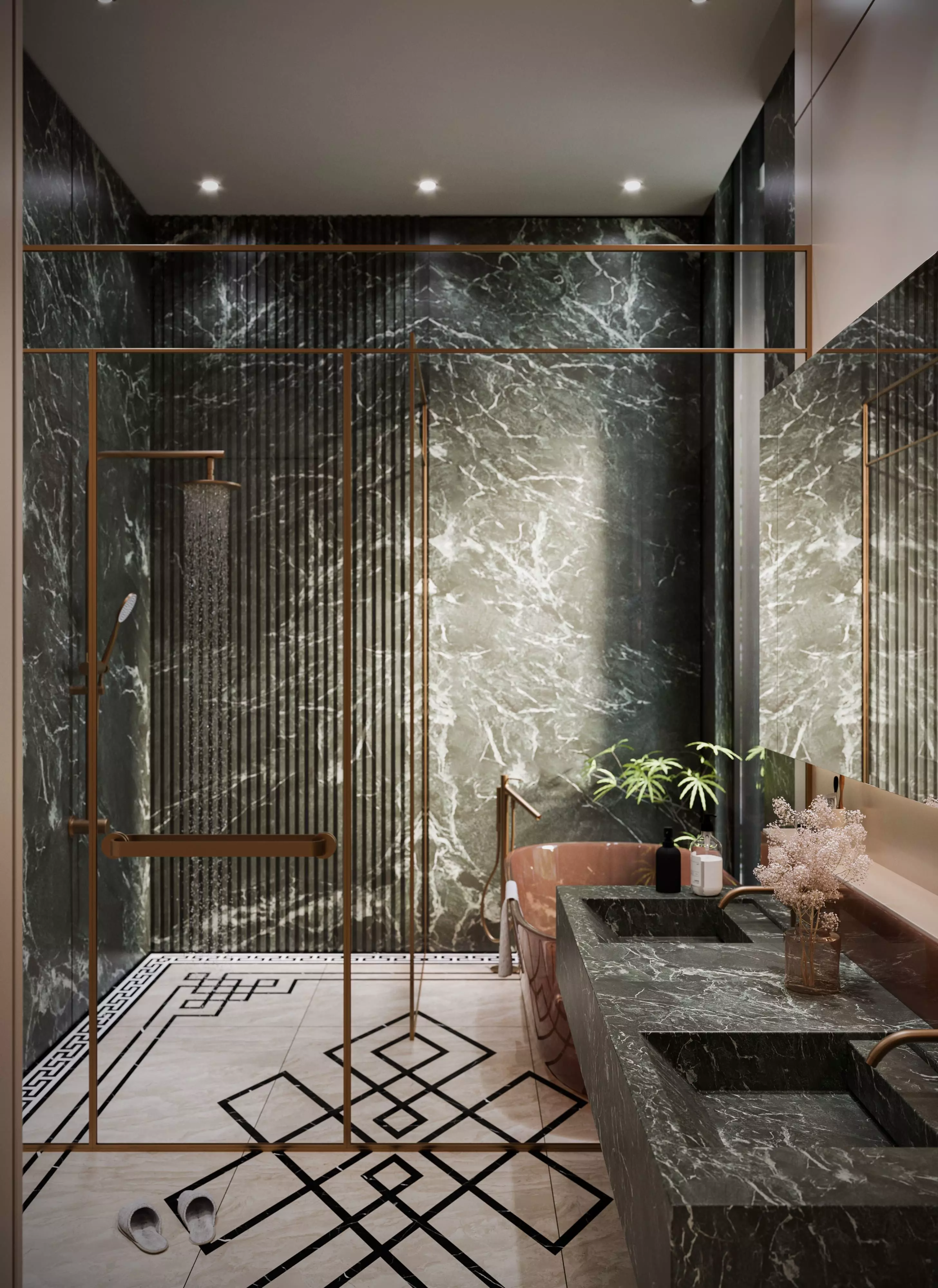 This high-end luxury bathroom 3D model features a meticulously designed space that exudes elegance and sophistication. The scene is centered around rich green marble walls with natural veining, complemented by a matching double vanity sink and premium brushed bronze fixtures. The design includes a walk-in glass shower with a rainfall head, a sculptural freestanding copper bathtub, and intricate black geometric inlays on polished marble flooring for added visual impact.