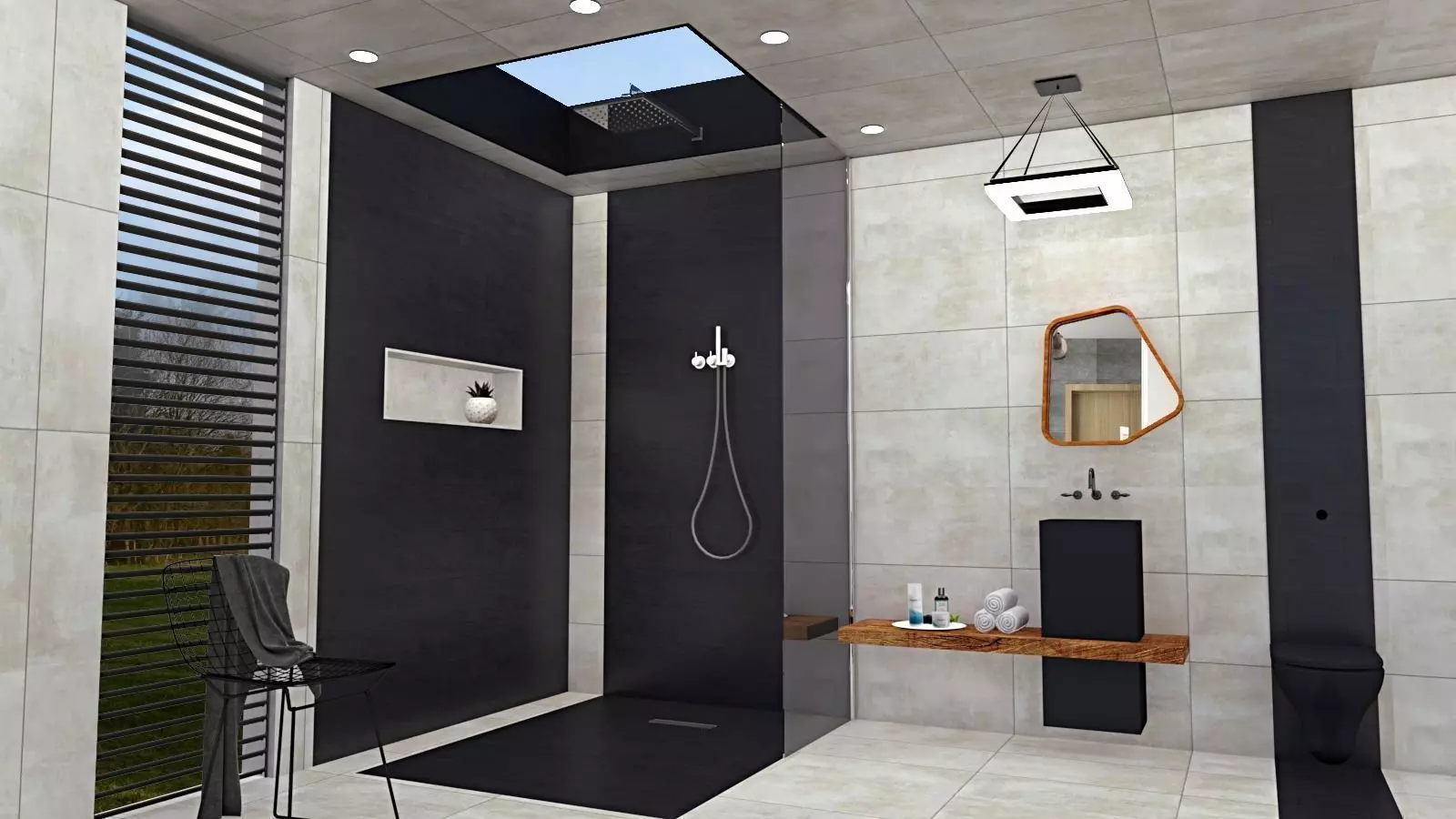 modern bathroom 3dmodelModern designed bathroom in black colour scheme design.Unique designed,modern,highly detailed model with lot of useful 3D models in it.Model contains sink faucets,shower,chairs, and other needed minimalist furniture.Also feature a window above shower., black toilet...Model is done with sketch up and rendered with v-ray. All textures and furniture equipment are in high resolution,have been checked and are included in scene.Textures are compressed in zip file.Model is easy to manipulate and ready to render with v-ray.