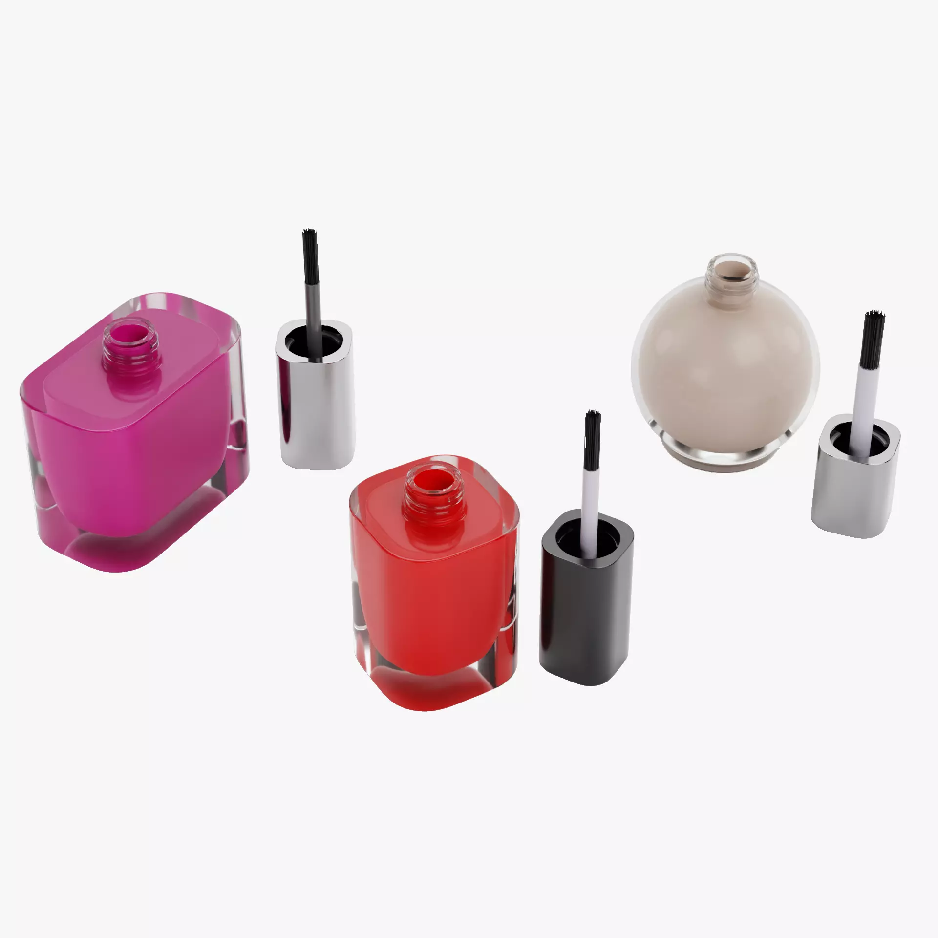 A collection of three realistic nail polish bottles based on common cosmetic packaging used for nail lacquer and manicure products. The set includes square, rectangular, and round glass bottle designs, making it easy to create varied nail product scenes. Each bottle features a removable cap with applicator brush and a filled polish container, allowing the models to be presented closed or with the brush displayed separately for product visuals and packaging mockups. Brush bristle particle system is included only in the Blender file.