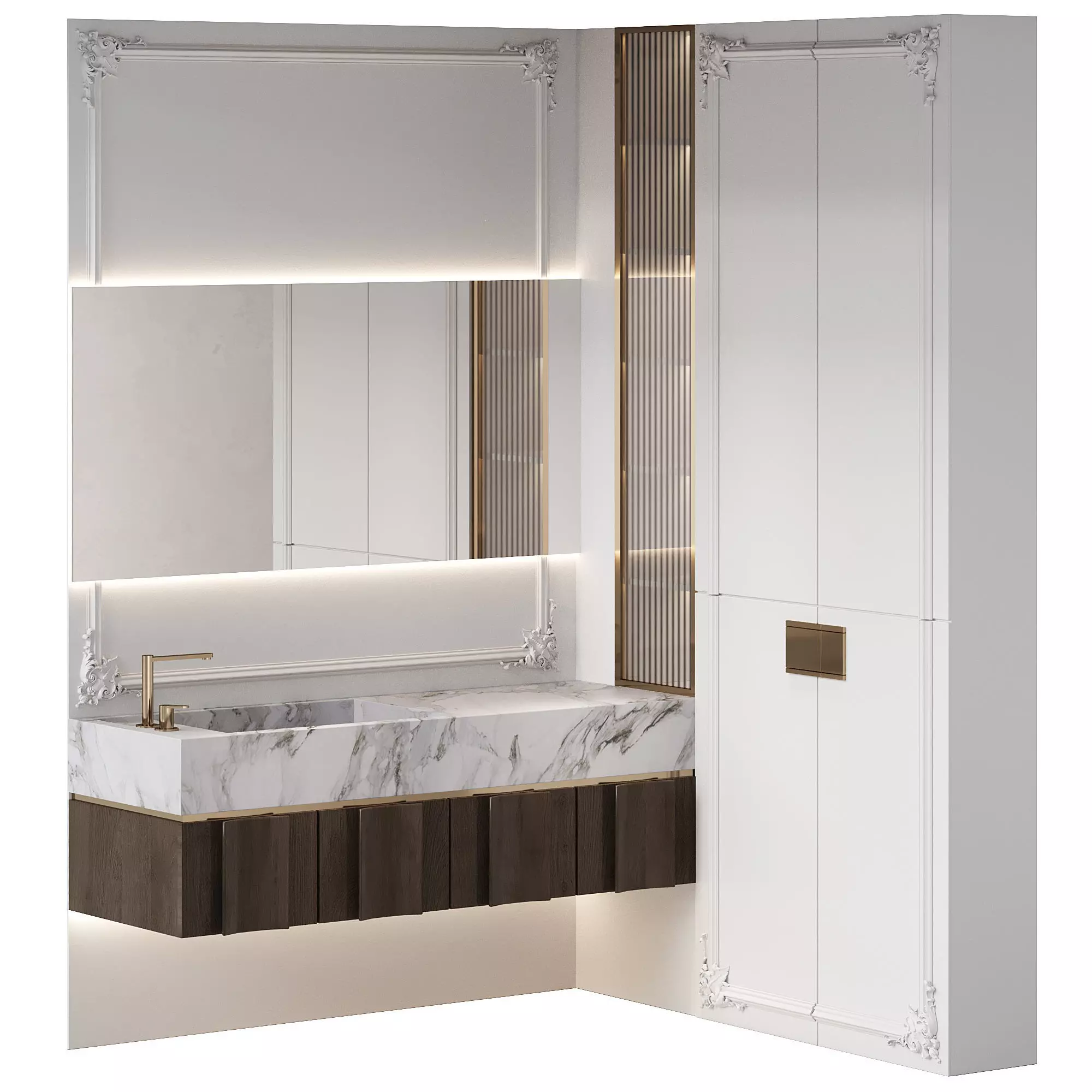 Bathroom furniture in neo-classical style with stucco decoration and glass shelving.