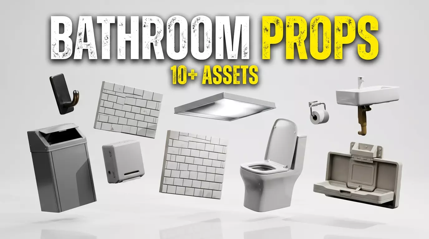 11 essential public bathroom and restroom props including modular floor and wall tiles for game environments.