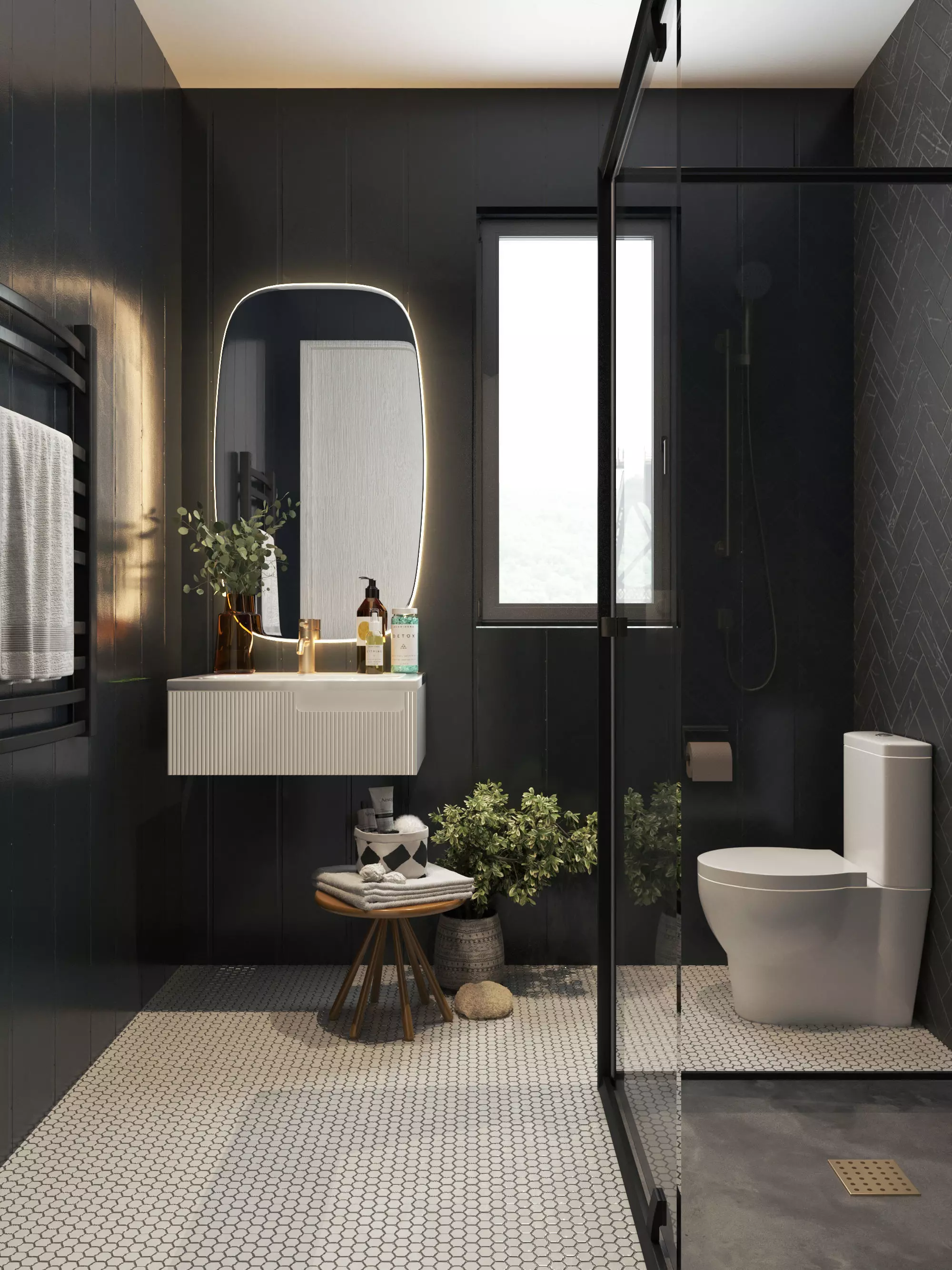 Max with V-Ray. The scene includes a wall-mounted vanity with ribbed paneling, a backlit organic-shaped mirror, a glass-framed shower cabin, a modern toilet, accessories, plants, towels, and carefully curated decor items.All materials use optimized V-Ray shaders with clean PBR workflows, balanced reflections, and accurate lighting behavior. Geometry is clean, well-organized, grouped, and named for stress-free editing.Lighting is set up for both realistic still renders and animation-ready output, using a mix of soft indirect illumination and controlled highlights.This scene is ideal for interior designers, archviz artists, and anyone who wants a polished, ready-to-render bathroom without spending days modeling pipes and tile grout. Just open, render, and pretend you slept last night.