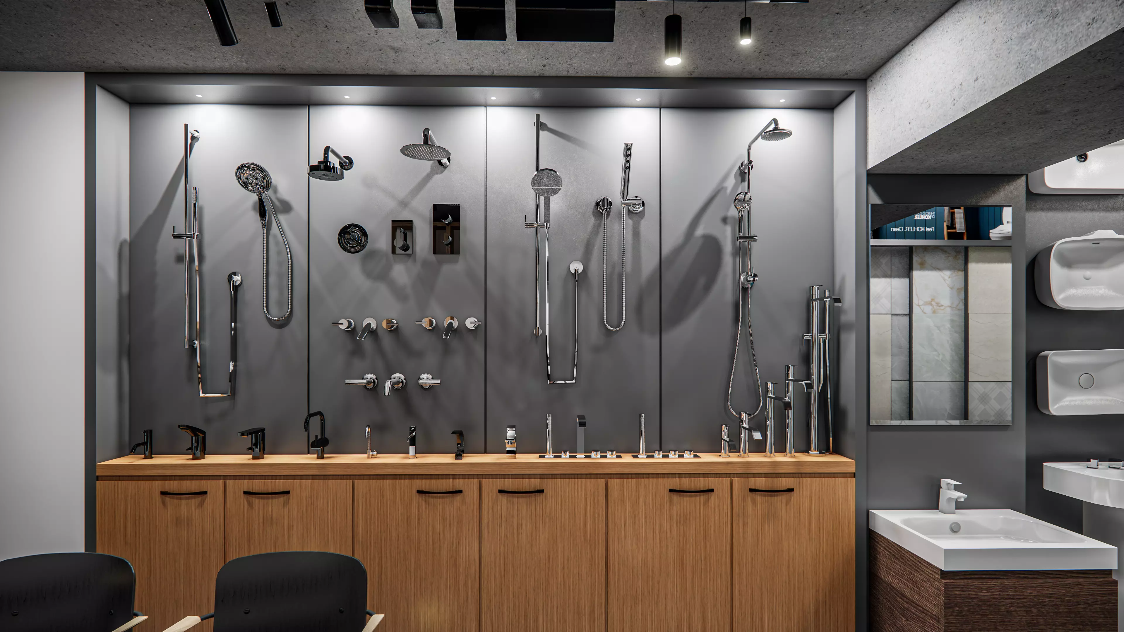 This high-quality 3D model showcases a comprehensive showroom interior meticulously designed to exhibit a wide range of construction-related products, including sanitary ware, marble slabs, tiles, and plumbing hardware. The layout is crafted to reflect a real-life showroom environment, optimized for spatial experience, product visibility, and customer engagement.