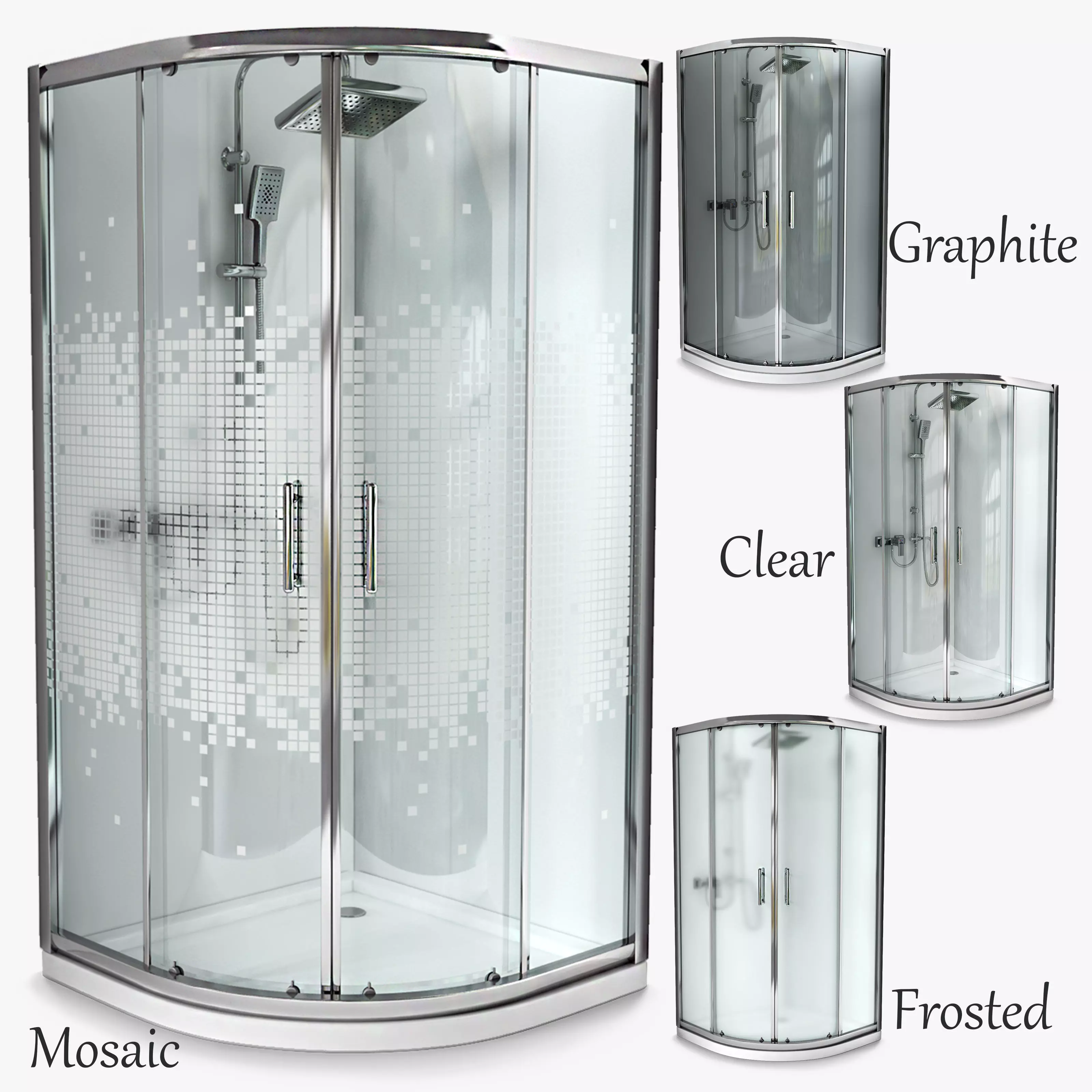 The scene file contains 4 groups: 1 Shower_Cabin Clear; 2 Shower_Cabin Frosted; 3 Shower_Cabin Mosaic; 4 Shower_Cabin Graphite.