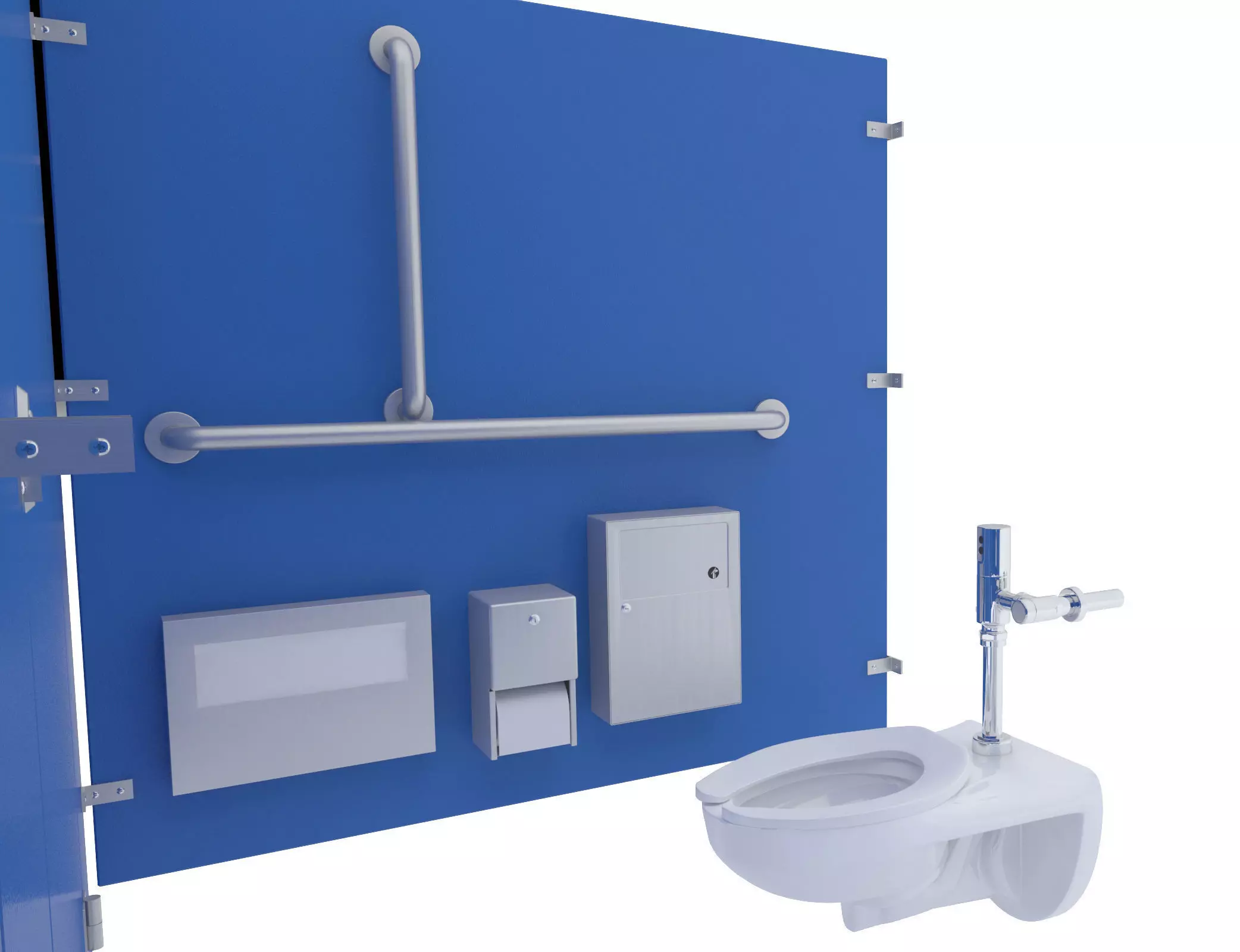 Set of partition stalls, 3 stalls, 1st is ADA 56W'x60'D, second two are 36'Wx60'D.-ADA stall includes Toilet, Grab Bars: 36, 42, & 18" Vertical Bar, Toilet Paper Dispenser, Sanitary Napkin Dispenser, Toilet Seat Cover, Non ADA include Toilet, Toilet Paper Dispenser, & Toilet Seat Cover Dispenser-1' Thick panel dividers, all objects modeled to scale. -First stall has all brackets and panel for end piece-Last stall has all brackets and panel for end piece-Can add many more in between the middle stalls-All brackets, locks, hinges, included-Blue Colored panels with stainless steel hardware, maps included. Color of partitions can be changed to any color-Modeled in 3ds max, rendered using Vray-All objects grouped into 1 group. Doors grouped into door so you can rotate the door open.-Rotate door open by opening main group, then rotating door open to desired location, if Pivot is not set to hinge move it to hinge by going to 'Hierarchy' ---> Click on 'Affect Pivot Point' then moving pivot point to center of hinge.-All objects at 0,0,0 for easy scene movement.