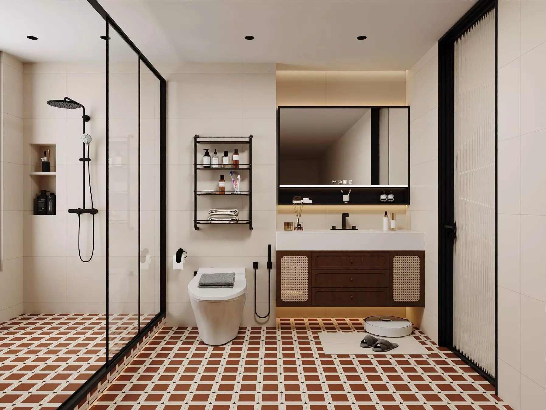 A warm Japandi ensuite designed as a calm, spa-like retreat. Soft cream walls and a continuous cove light set a relaxing mood, while crisp black fixtures outline the architecture. The centerpiece is a floating vanity with a seamless white top and rattan-front drawers that add natural texture without visual weight. Above it, a full-width smart mirror with an integrated shelf reflects the glow of the backlight and keeps daily items tidy. A walk-in shower is framed in slim metal with a rain head and wall niche for bottles. The floor uses rich terracotta-and-ivory grid tiles that ground the palette and add subtle pattern. Storage is solved with a minimal wall rack and a concealed base under the vanity. Small props—aroma diffuser, rolled towels, slippers and a low robot cleaner—bring life without clutter. The layout is optimized for clean camera paths: wide front elevation, diagonal hero, close-ups of the vanity, mirror, shower and floor. Materials are authored for soft, realistic reflections: matte ceramics, brushed metal, wicker weave, frosted glass and satin paint. Perfect for residential bathrooms, hotel suites or lifestyle renders where you need a cozy, modern atmosphere with timeless details.