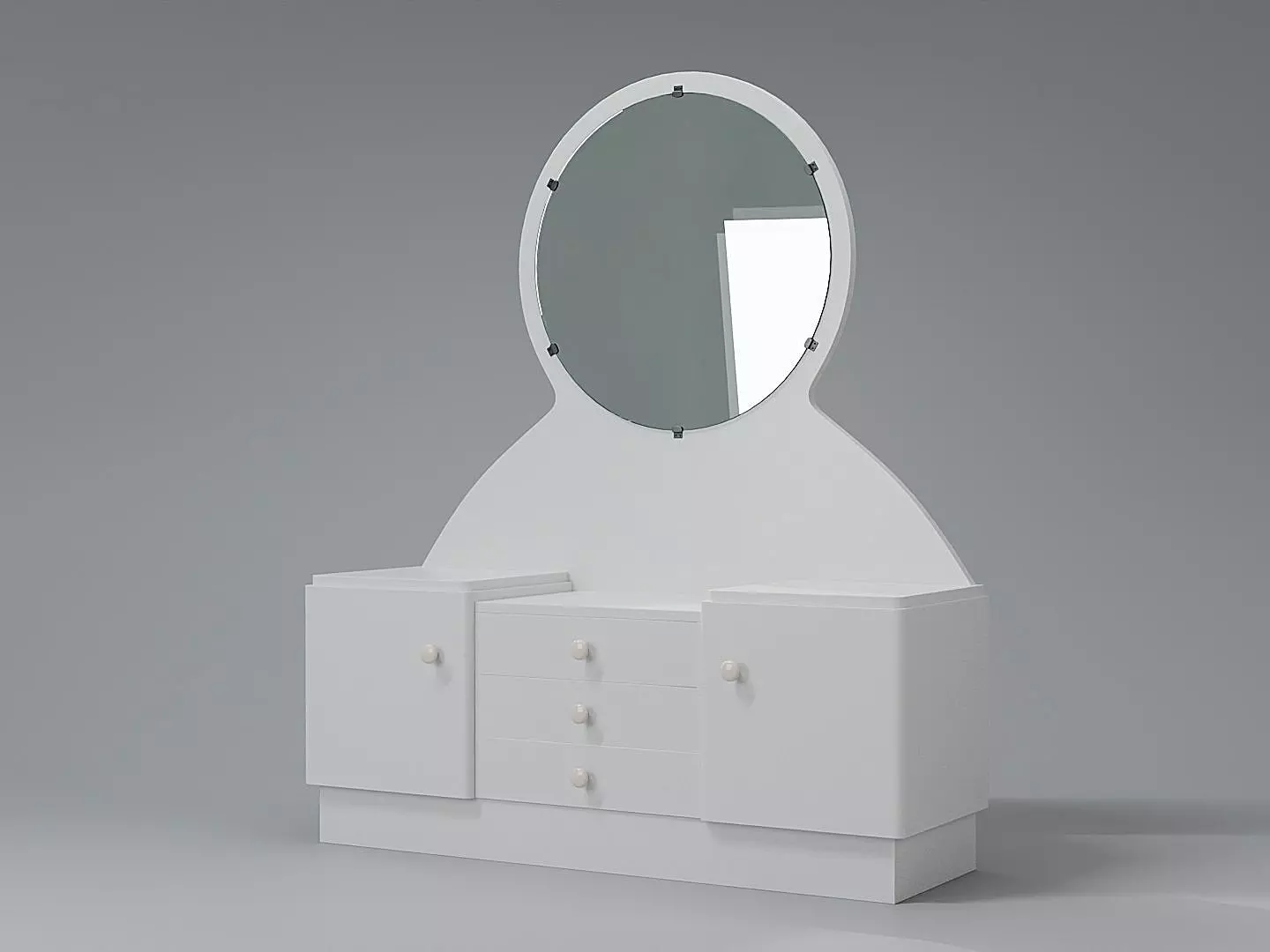 3D model of a vintage dresser with a round mirror This dresser is a typical dresser from the 1960 to 1970 ties. The round shapes make it soft and subtle. The white color makes it light for in a bedroom. The dresser has three drawers and two cubic store cabinets with doors.