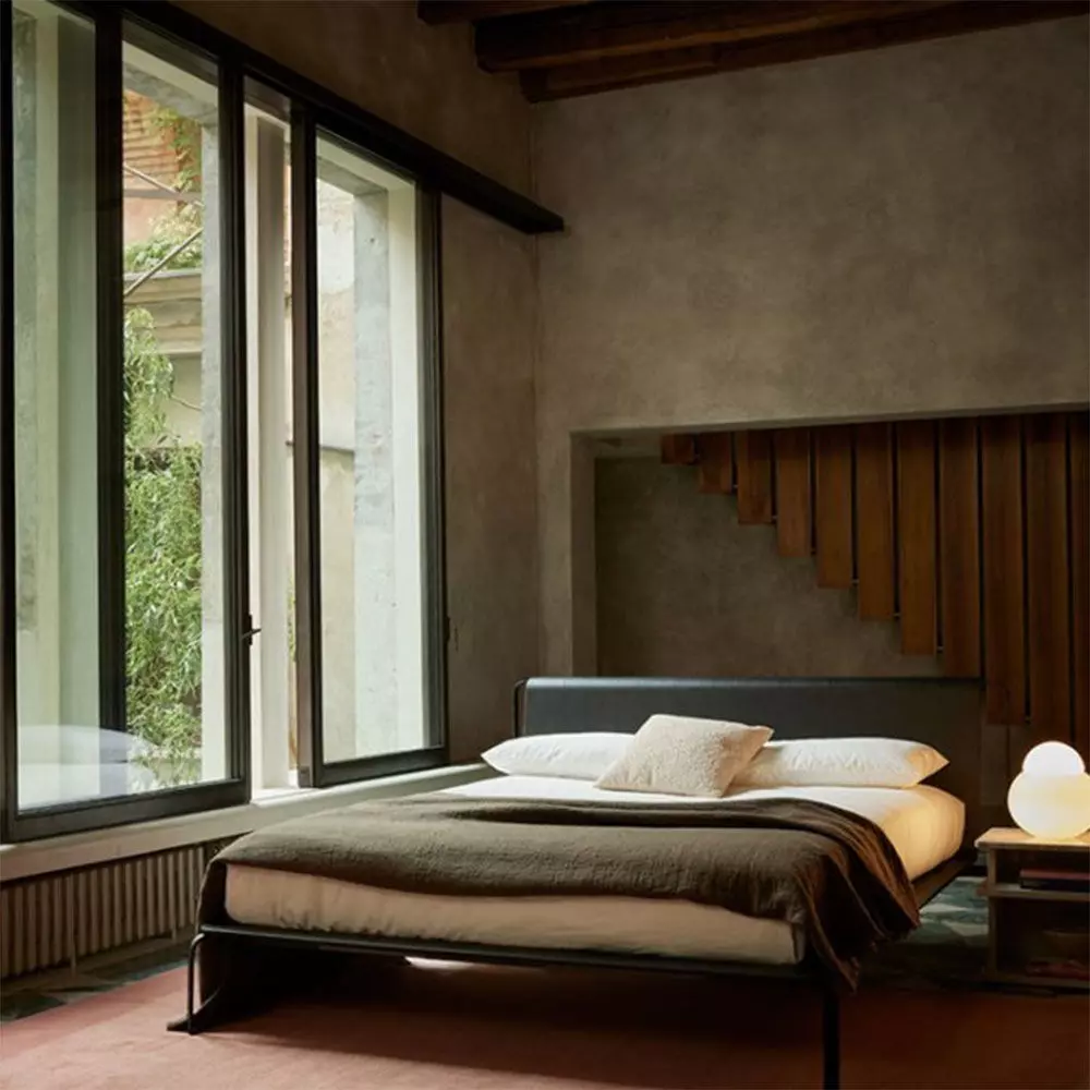 Style: Contemporary/minimal, thin metal frame with rolled headboard
