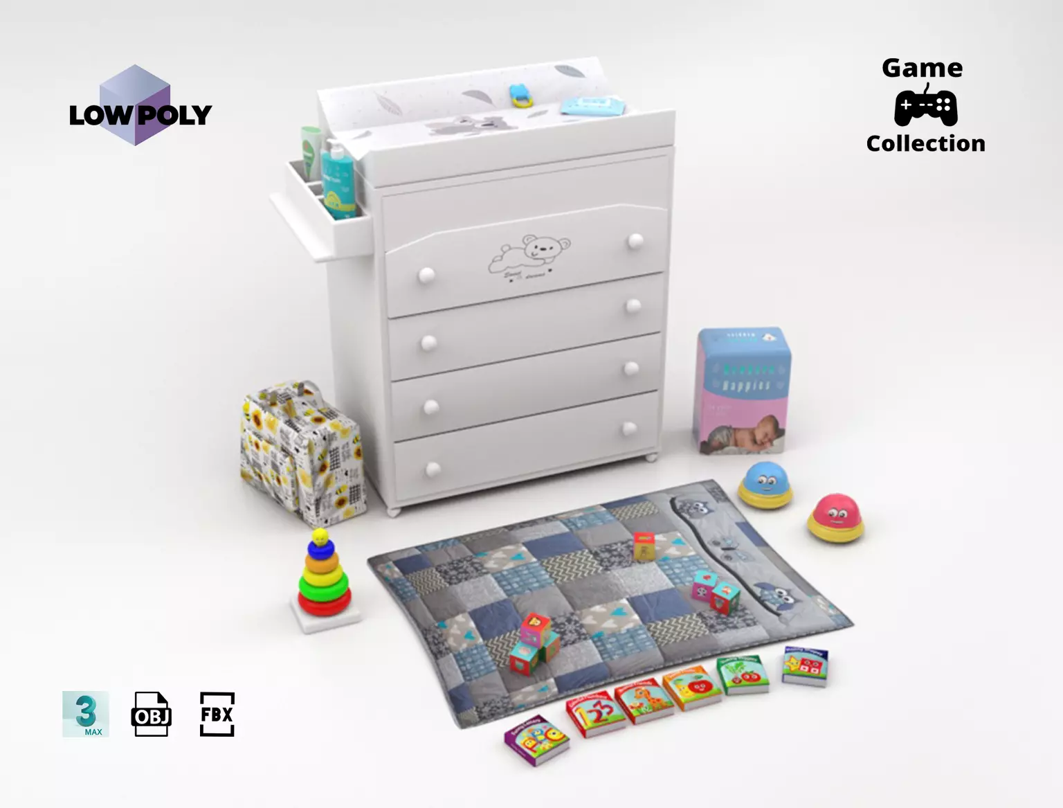Collection of 25 different models for a baby room. The poly count of the models ranges from 54 to 5902 polys. So, they are ready for games or 3D scenes which require low poly objects . They have been created in different 3D Studio Max versions , FBX and OBJ. All the models have their pivot point correctly positioned on the base to be comfortably used in game engines like Unity or Unreal.