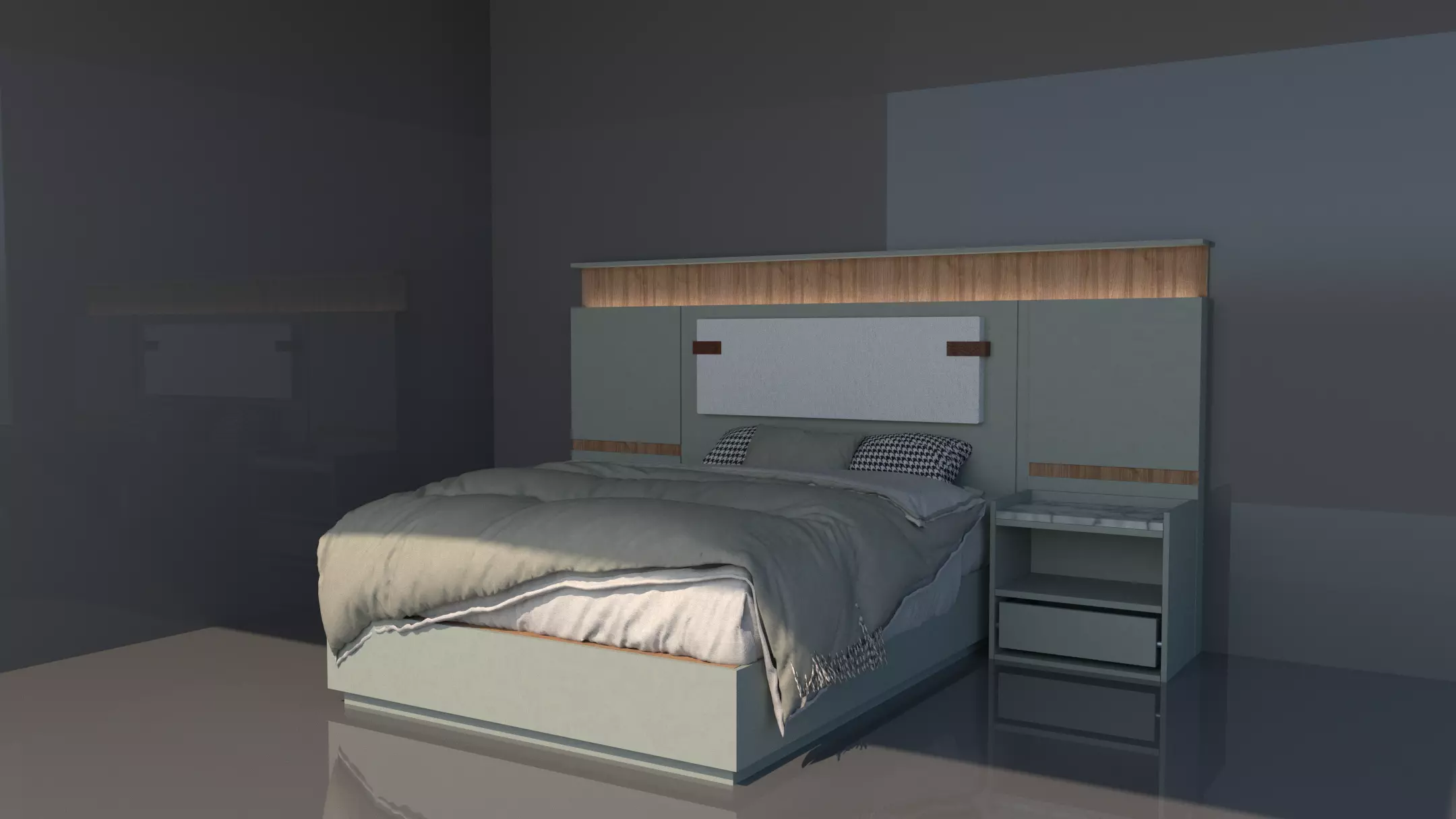 A luxurious design that blends modern minimalism with the calming touch of olive green, creating a warm and inviting atmosphere for master bedrooms. Featuring sleek lines and matching nightstands, this piece is perfect for upscale hotels or contemporary homes. All details and materials are crafted with high quality, ready for use in architectural and interior design projects.bed set include ( bed back - bed - 2 night stands )