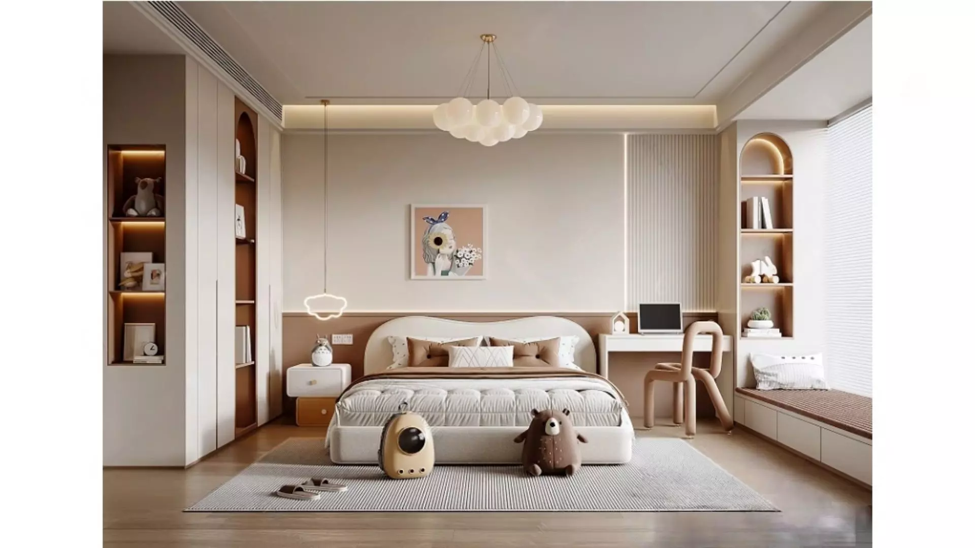This is a cream-style bedroom dominated by milk tea color tones, with an overall warm, healing, and relaxed atmosphere. The space combines the soft texture of modern minimalism and light French style: the walls adopt a combination of low-saturation off-white and warm brown, paired with a bedhead with curved lines, built-in storage cabinets, and an arch-shaped shelf, which weakens the rigid feeling; the combination of no main light, spherical chandeliers, and cloud-shaped wall lamps makes the light soft and not dazzling; the bedding uses soft packs and throw pillows of the same color system, adding a soft and cozy wrapping feeling.At the same time, the space takes practicality into account: a storage cabinet with ambient lights is embedded on one side, and the bay window on the other side is transformed into a booth, with a desk next to it to form a small office area, realizing the integrated function of bedroom + study. It not only maintains visual tidiness but also meets the needs of daily living and light office work, making it a healing living space with both aesthetic appeal and practicality.