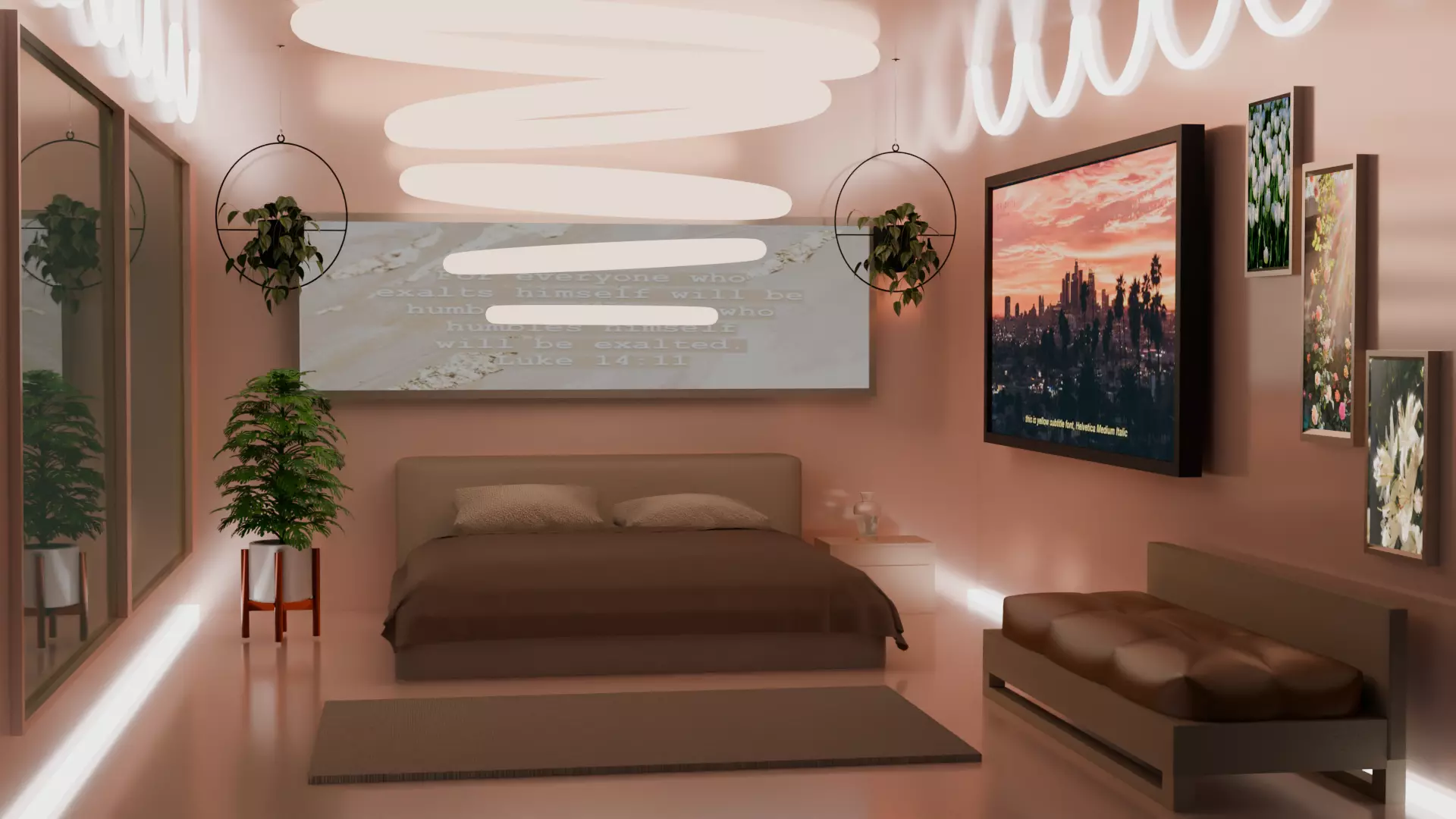 The room set includes:One bed, 4 paintings, one TV, a chandelier, one small sofa, a vase with a palm tree, two hanging flowers, a bedside table, and a vase.The room is made in soft, calm colors. There is a large bed in the middle of the room, next to which is a bedside table with a vase and a palm tree on the other side. Above the bed is a large picture and two flowers. An incredible chandelier hangs from the ceiling. The room has 2 large windows, and on the other wall, there is a TV and 3 paintings. Under the walls, there is a sofa and a large carpet in the middle of the room. The design is suitable for creating a game and a cartoon, and for making a real room based on its motives.