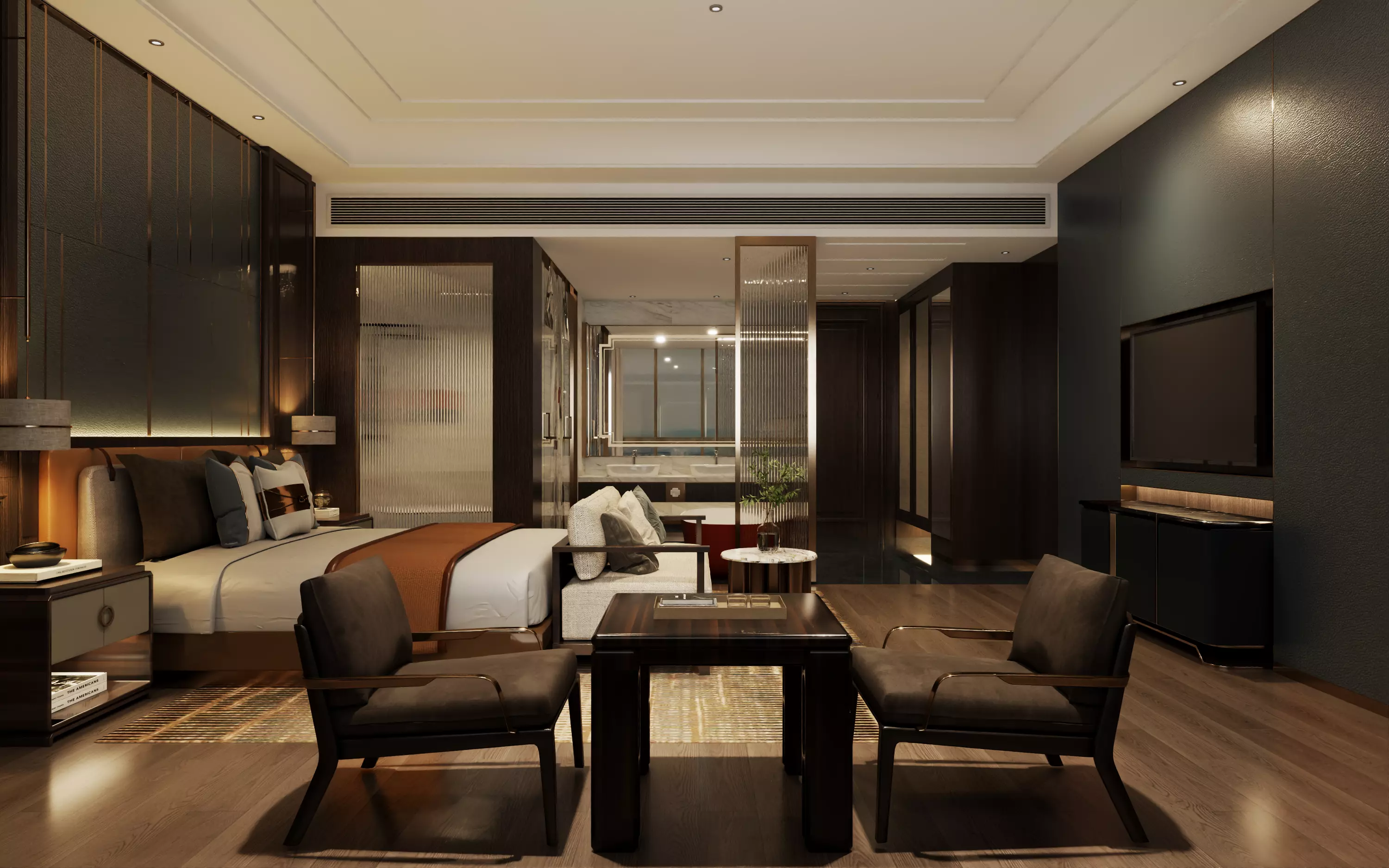[Product Overview]This is a high-quality, photorealistic Luxury Modern Hotel Suite 3D scene designed for premium hospitality and interior visualization projects. Meticulously modeled in 3ds Max and fully optimized for the V-Ray rendering engine. The scene embodies a sophisticated dark-toned aesthetic, seamlessly integrating the sleeping area, a refined lounge, TV console, and a semi-open bathroom with stylish fluted glass partitions.[Key Features]Cinematic Lighting: Pre-configured with a multi-layered lighting system (Spotlights, COB strips, pendant lights) to create a premium moody atmosphere.Exquisite Materiality: Features high-resolution textures for wooden flooring, textured wallpaper, metallic trims, fluted glass refraction, and high-detail leather/fabrics.Complete Asset Set: Includes a full furniture collection: luxury bed, armchairs, coffee table, bench, TV console, and full architectural structure.Universal Compatibility: Includes native .MAX (20XX) files alongside thoroughly tested .FBX and .OBJ formats for a seamless cross-software workflow.Professional Standard: Optimized mesh structure with Non-overlapping UV mapping. All assets are logically named and texture paths are stripped for a hassle-free setup.[Included Files].MAX (Native 3ds Max format with complete V-Ray shader and lighting setup).FBX (With embedded coordinates and texture paths).OBJ (Standard geometric format)Textures (Folder containing high-res seamless textures: Diffuse, Normal, Gloss, Reflect, etc.)