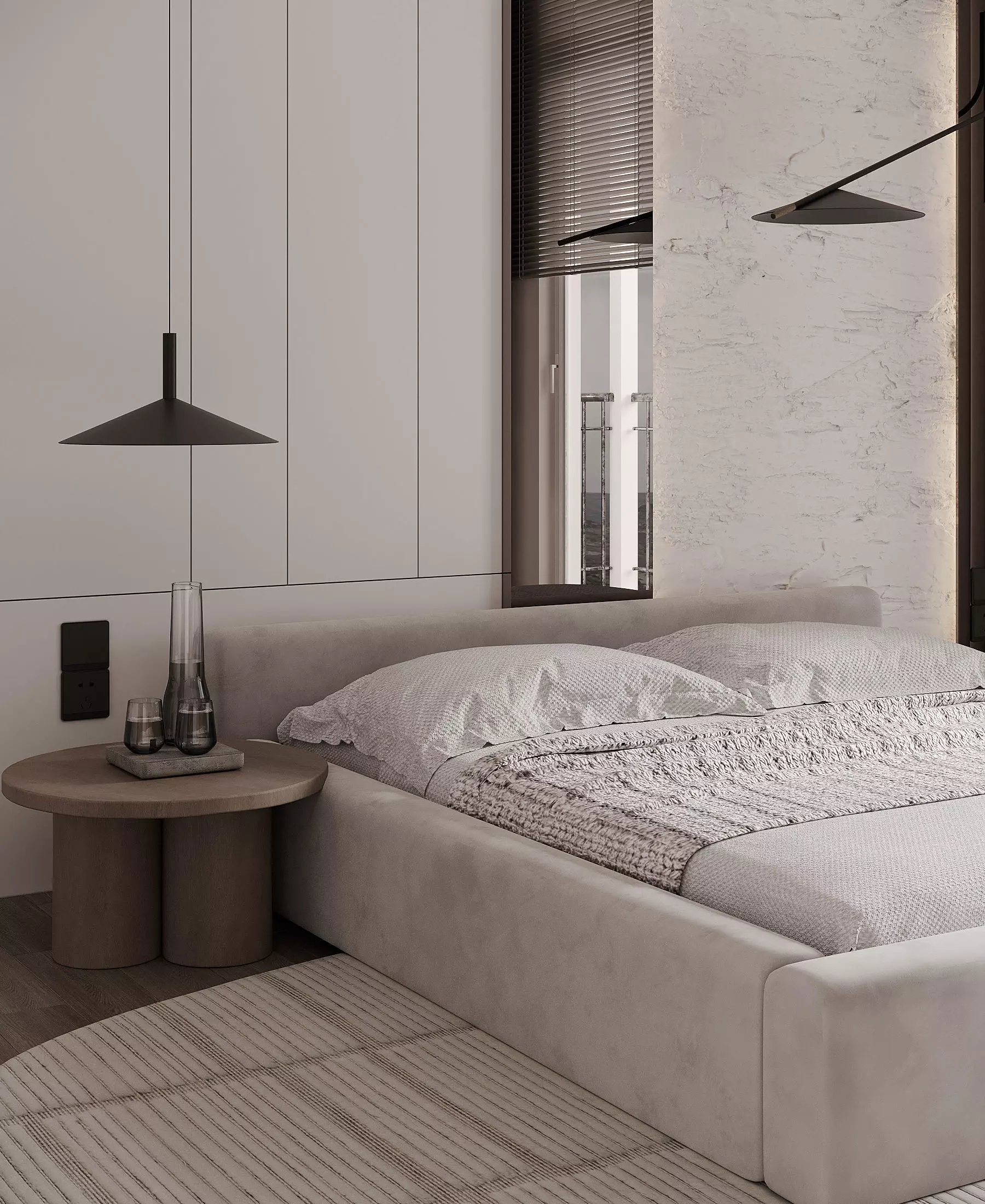 The color palette is carefully selected to enhance spatial depth and tranquility, while modern furniture elements and minimal decorative details contribute to a sophisticated and timeless look. Every design decision supports a comfortable, uncluttered, and visually appealing bedroom environment.