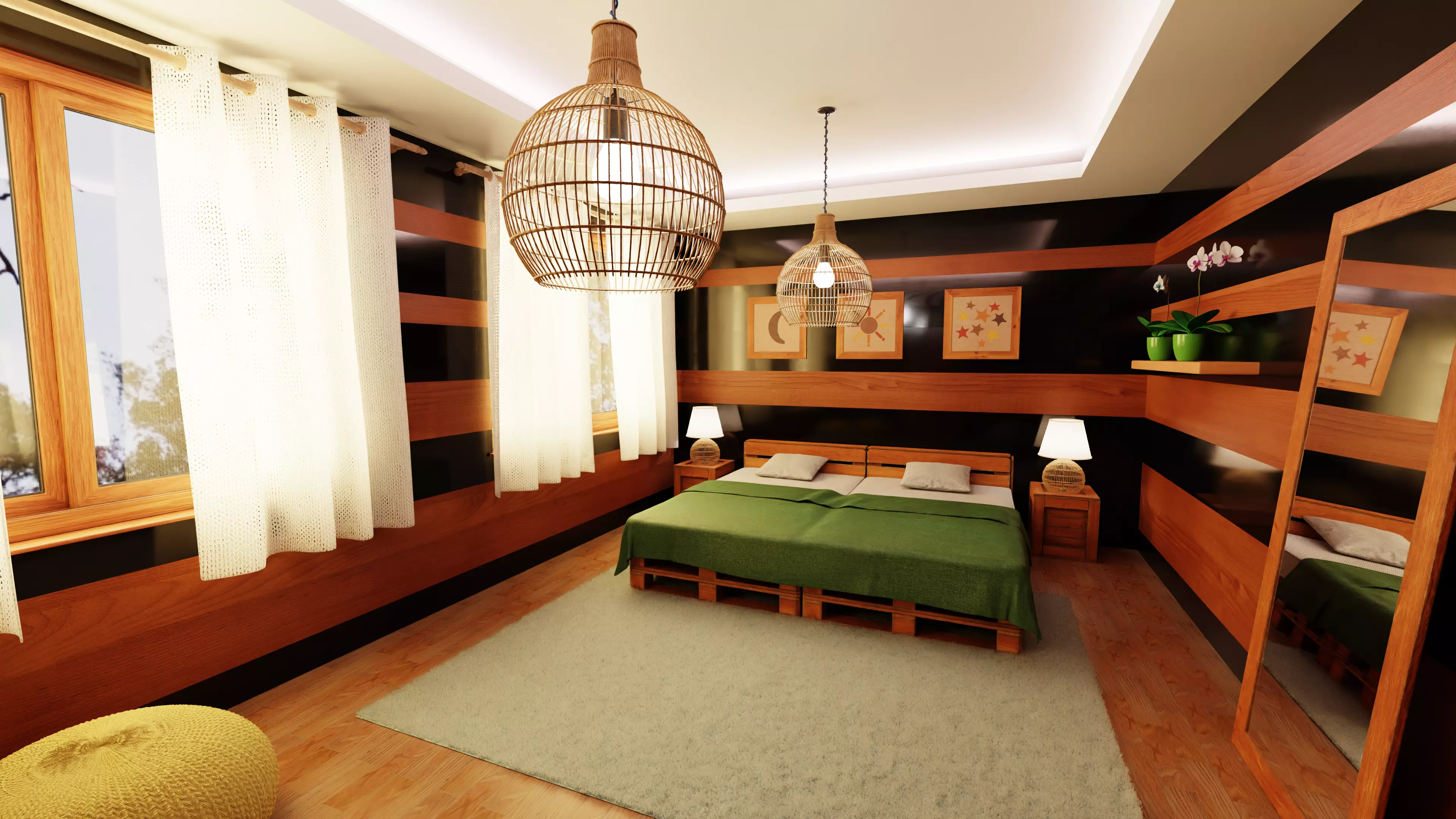 • Fully furnished bedroom interior scene with pallet-style bed
