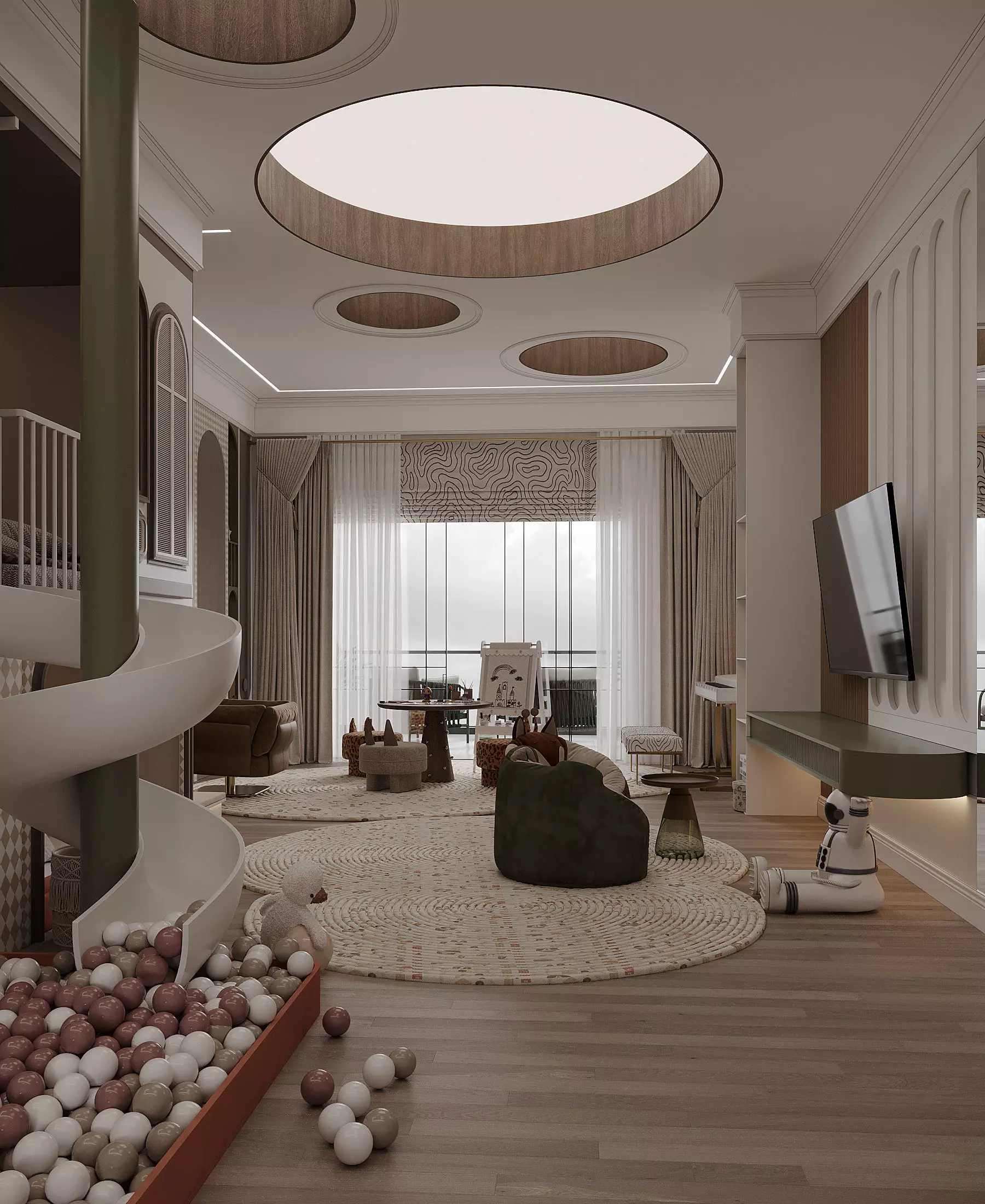 The layout is open and well-balanced, allowing free movement and multiple activity zones. A custom-designed spiral slide acts as a key visual and functional feature, seamlessly integrated into the architecture. The ball pit below enhances the interactive character of the space and adds a dynamic focal point without overwhelming the interior.