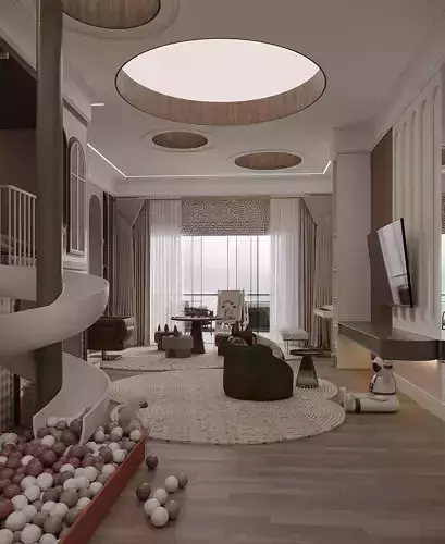 This 3D interior scene represents a modern children’s playroom designed with a strong focus on functionality, safety, and refined aesthetics. The space combines playful elements with a clean architectural approach, making it suitable for high-end residential projects, visualizations, and presentations.