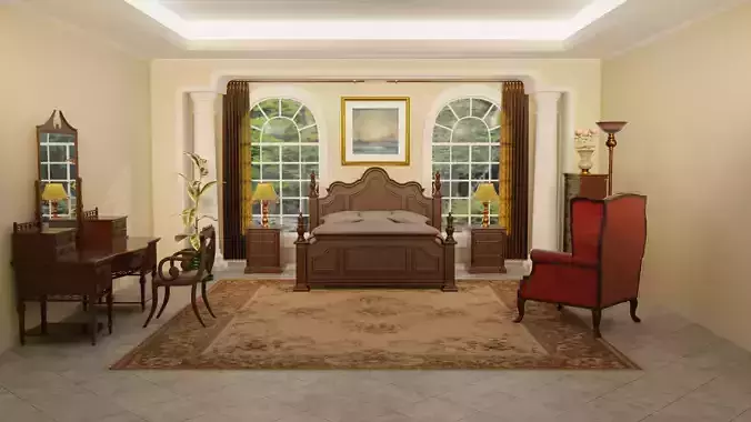 Included Assets (Scene Contents)Architecture / Room• Modular bedroom room shell (walls / ceiling)• Ceiling crown molding / cornices• Arched window wall with multiple window openings• Arched niches / architectural columns (decorative wall structure)• Large double arched door (center wall)• Floor (stone tile / large format tiles)• Baseboards / trims• Window glass elements