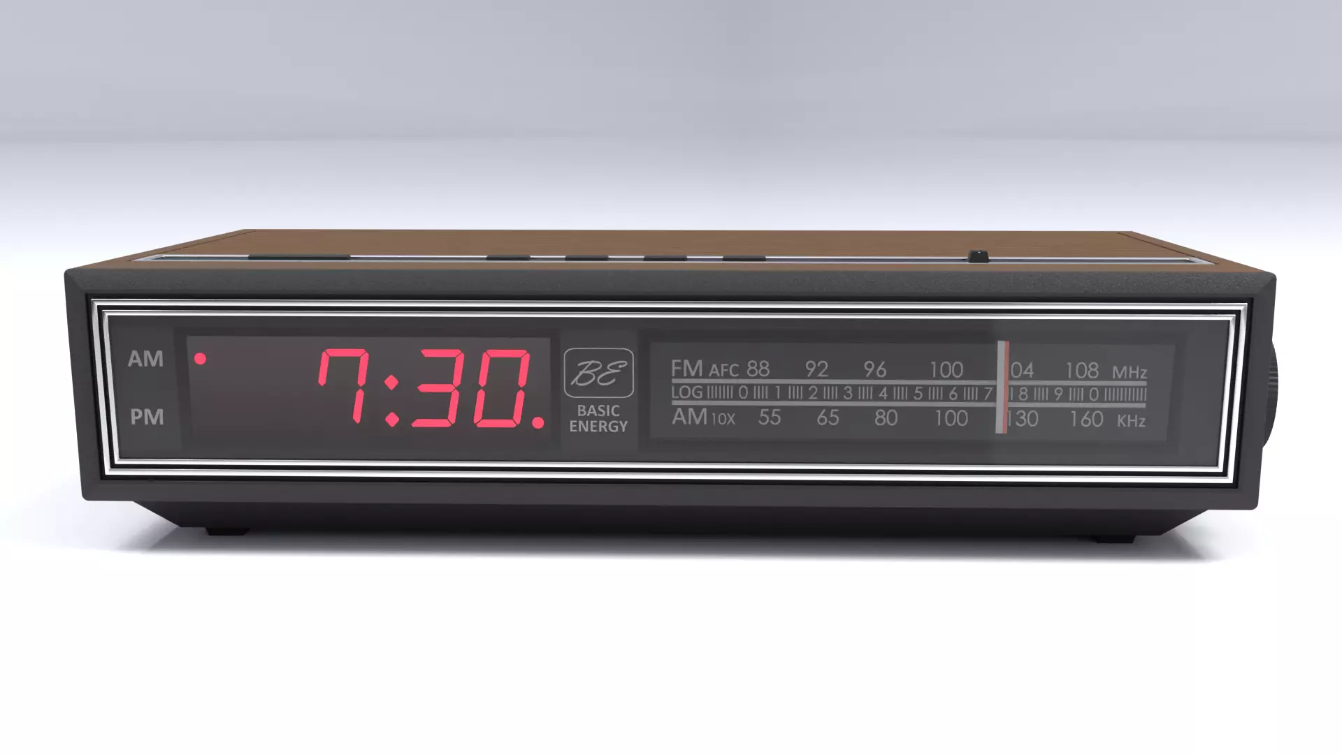 This clock was not modeled to any specs and is not meant to be an exact replica of any particular model. It is an excellent representation of several variations of digital alarm clock radios that were common from that time period. Basic Energy is a fictional company. The Basic Energy logo, name, and brand are intellectual property of afterhours3dvfx and should not be used for other models/projects.