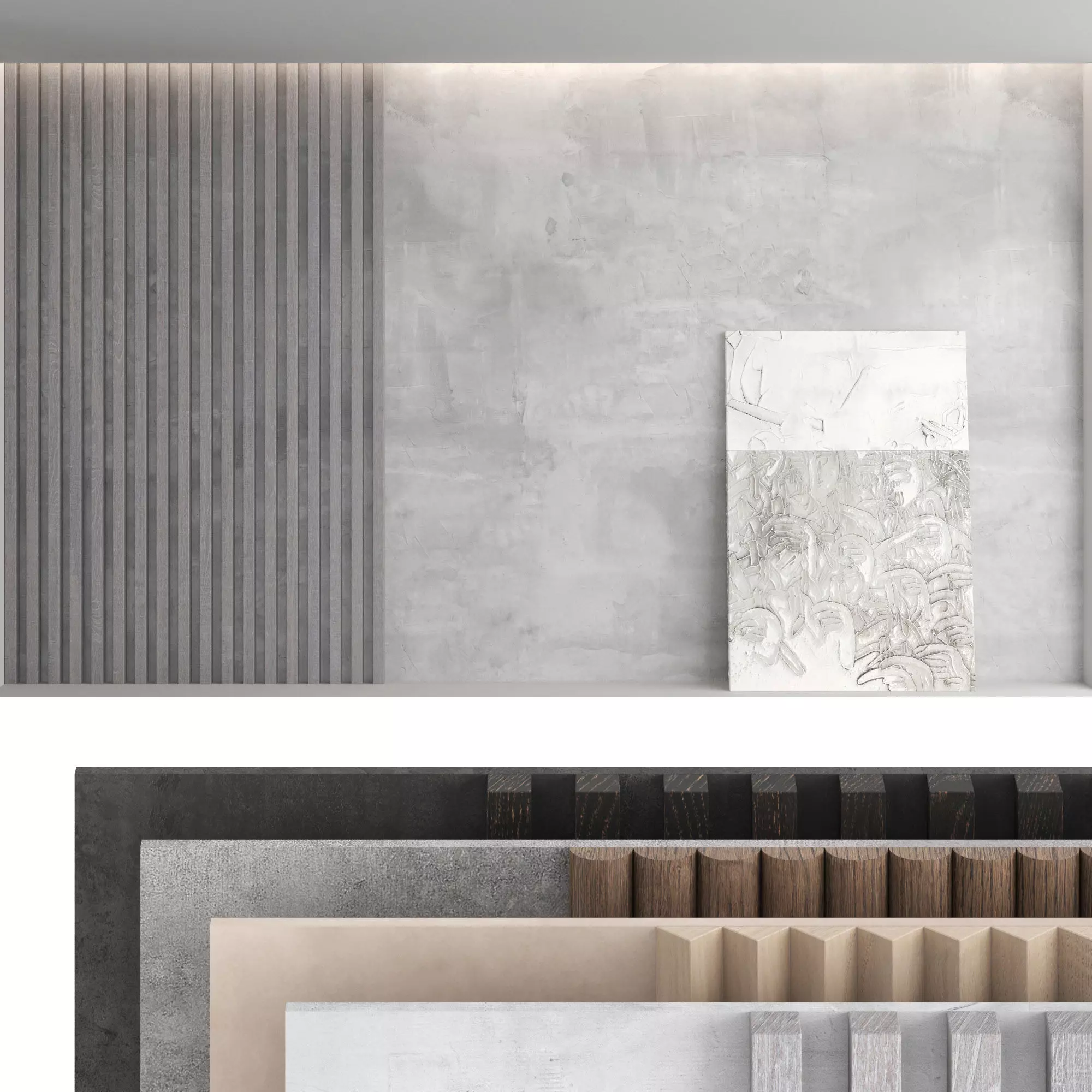 Headboard and wall panel4 types of configuration4 materials of decorative plaster (seamless high quality textures, resolution 8000x8000 pixels)4 wood materials (high resolution seamless oak textures, 8000x6000 pixels)And 4 paintings.Blades size: W.5000mm x H.3000mm