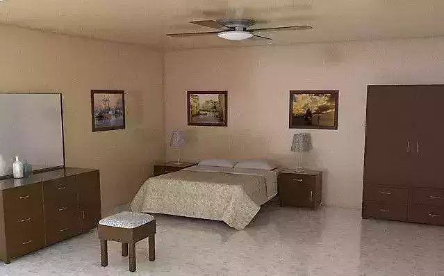 -2 Beds -Wardrobe -Dressing table-CeilingFan-Bed Lamps-Benchtosit-3 Pictures-Door, Walls, ceiling and floor