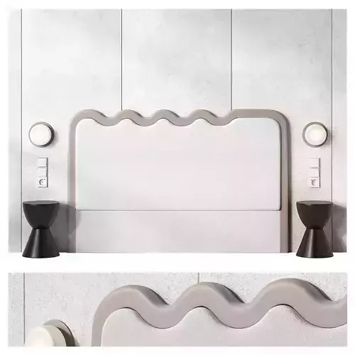 Decorative wall panellingThe wavy, smooth shape of the headboardThe composition contains decor: sconces, sockets, switches, bedside tables.Suitable for styles: modern, minimalism.