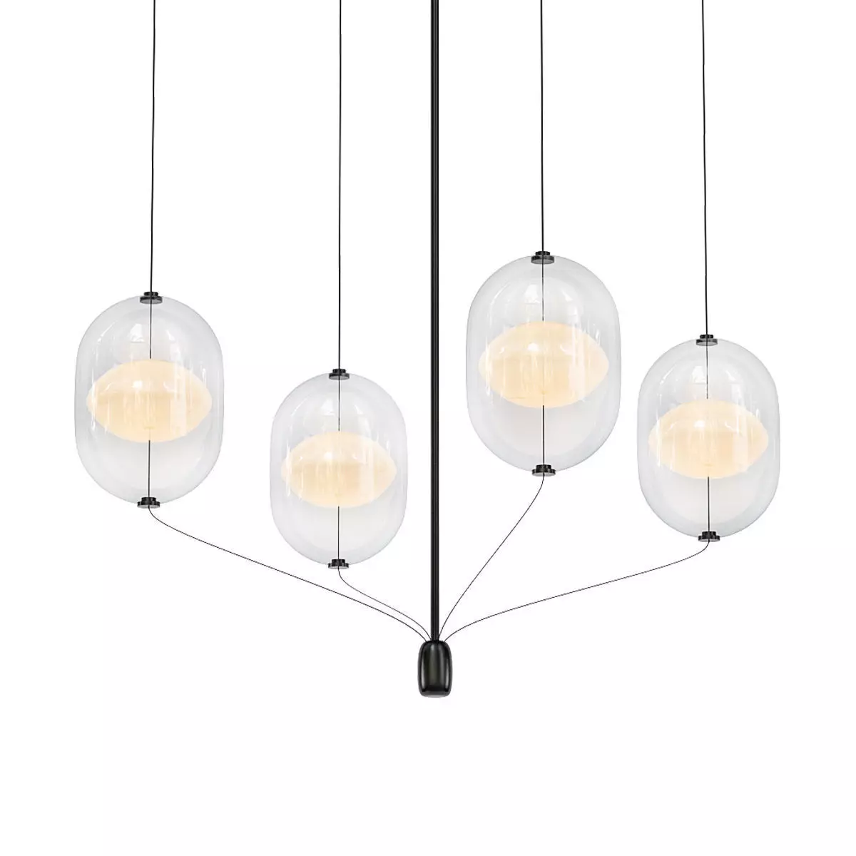An ode to the historic architecture of Copenhagen. Taking its cues from the suspended catenary streetlights and cobbled stone streets of designer Nikolai Kotlarczyk’s home city, Indre departs from the purely pared-back and minimal. Drawing on nostalgia and decoration, the collection delivers beauty through its delicately rendered double-wall glass capsules that gently cradle floating internal light. Individual capsules are connected by the graceful lines of a catenary-inspired interlinking rod system anchored with stone or timber detailing.