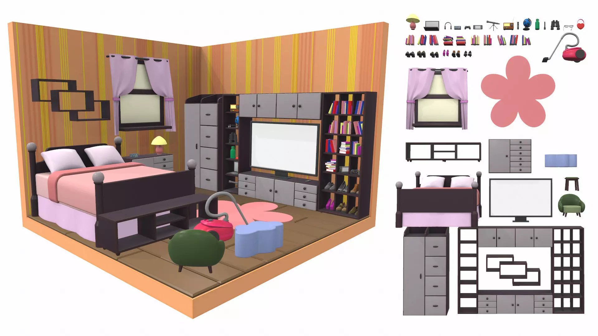 The model isometric cartoon bedroom is located in zero coordinates. UVW mapping created, all textures are in the zip archiveThe model isometric cartoon bedroom was created in 3Ds Max and textured in 3D coat. Previews of the model isometric cartoon bedroom are made in the Marmoset Toolbag program.