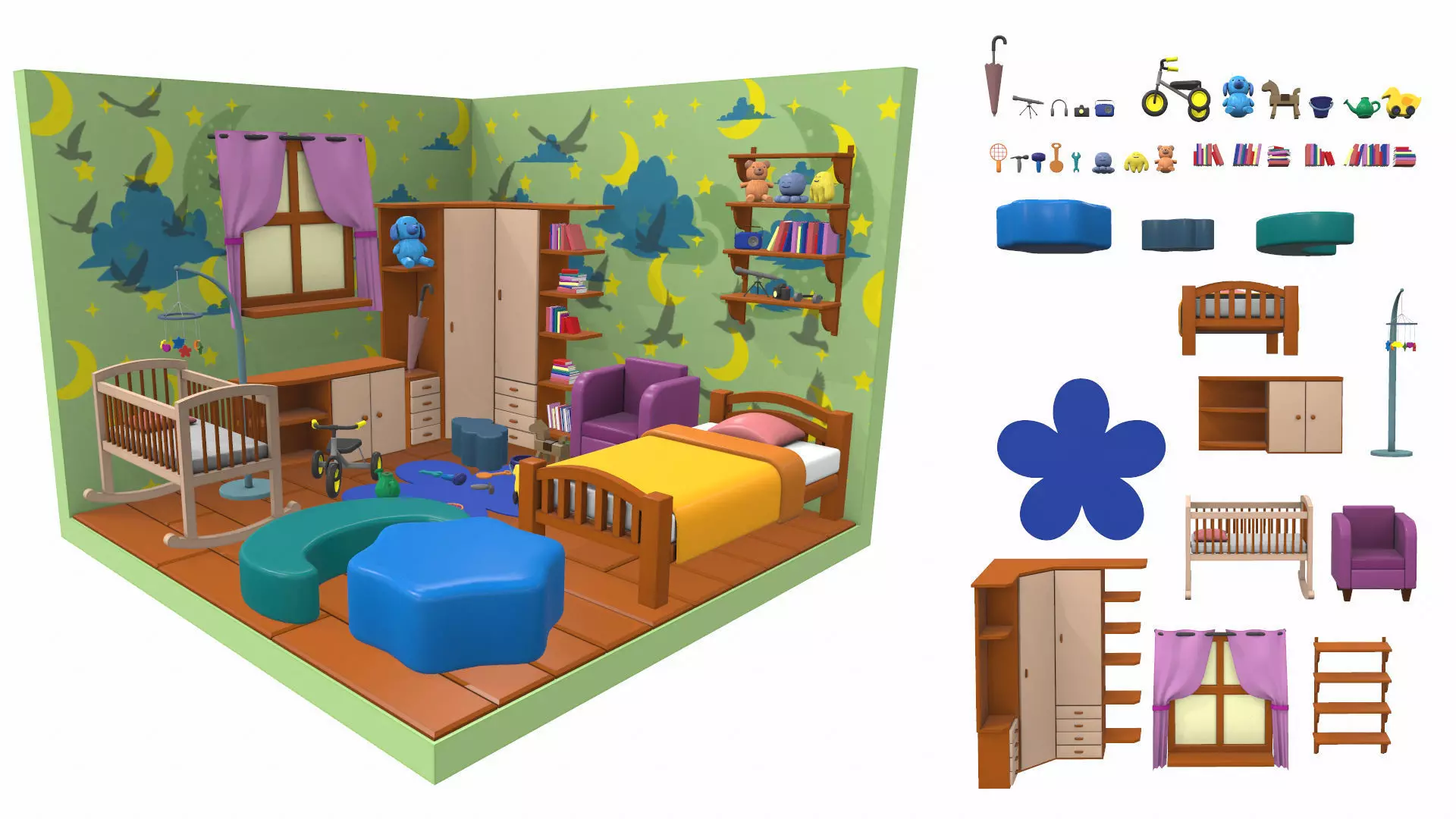 The model isometric cartoon children room is located in zero coordinates. UVW mapping created, all textures are in the zip archiveThe model isometric cartoon children room was created in 3Ds Max and textured in 3D coat. Previews of the model isometric cartoon children room are made in the Marmoset Toolbag program.