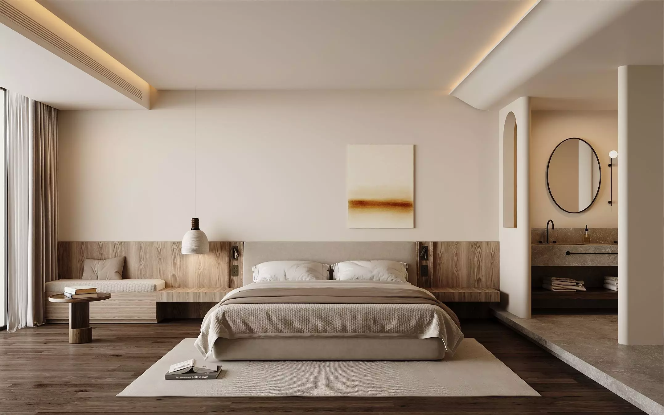 A soothing Japandi master suite designed around warm timber, soft textiles and restrained detailing. The bed sits low and generous with a padded headboard; a continuous timber headboard wall runs behind it and grows into a floating bench on the left for reading or lounging. Subtle cove lighting draws a fine line at the ceiling, while a ceramic pendant and compact reading lights add pools of glow. On the right, a half-open ensuite vanity is framed by an arched opening and a shallow step, featuring a stone basin, open shelf and round mirror—practical for lifestyle shots and cinematic camera moves.The palette is calm—oatmeal, sand and taupe—so texture does the talking: wood grain, woven bedding and a matte stone ledge. Circulation is generous on all sides of the bed; proportions are realistic for residential layouts. Multiple hero angles are available: centered frontal composition, 45-degree views toward the vanity, overhead shots emphasizing the rug, and close details of lighting and edge junctions. Use this scene to communicate hotel-level serenity with everyday usability, ideal for apartment suites, villas and hospitality proposals.