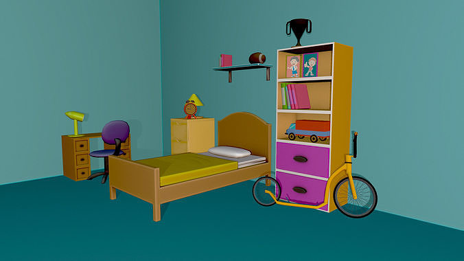 This is a complete setup of Kids Bedroom. Include the interiors likes cupboard, kids bicycle, study table & chair, bed, lamp, books and etc. Every model is separately available