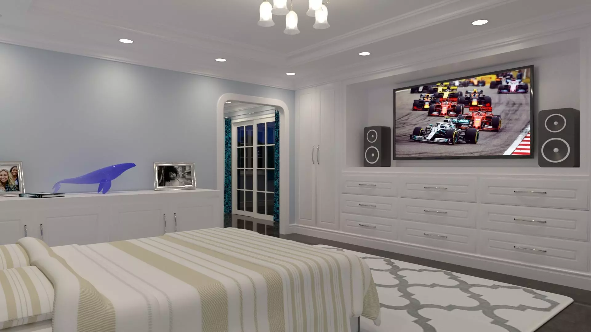 This large luxury through bedroom with ensuite bathroom has twin sinks with mirror and accsessories, toilet and bath tub. The whole room is 9 meters long by 5 meters wide with a large window on the front wall and a smaller window on the back wall with double sliding doors. The room has a full width fitted unit with full hight wardrobes each end and three sets of three draws in the middle. A large tv and speakers are mounted above the draws in the middle of the unit. Another storage unit with four doors is to the left of the bed. A double bed with four large draws two each side in the base and padded headboard is placed on a large white pattern rug. The whole room is lit with recessed lighting and three ceiling lights with five lamps per light at the centre of each area of the room.