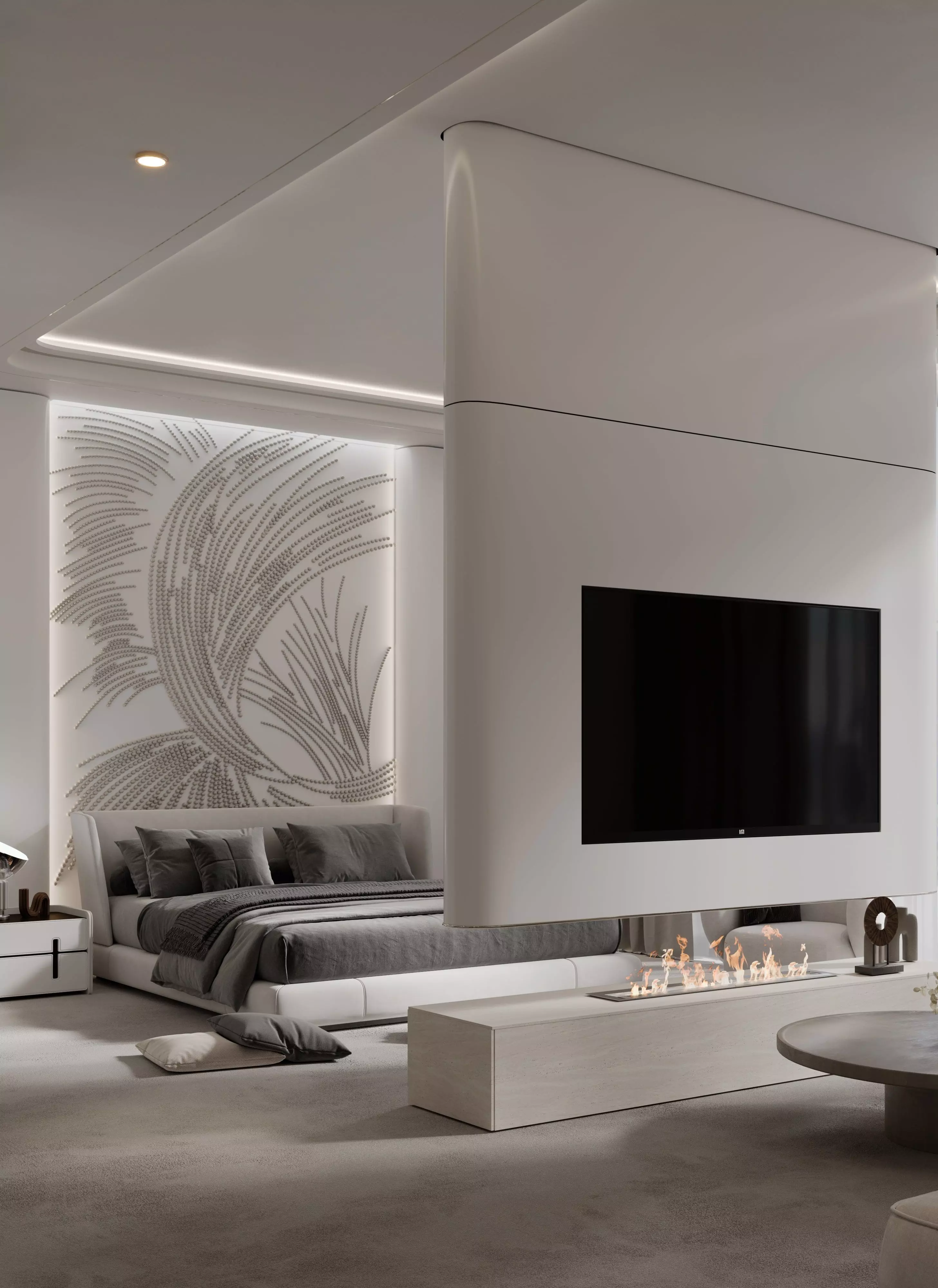 This design explores the seamless fusion of minimalist architecture and organic flow, where soft curves, luxurious materials, and carefully considered zoning come together to shape a serene and visually engaging space.A custom sculptural partition anchors the room—its curved, matte-lacquered surface integrates a floating TV panel while subtly dividing the space. Behind the bed, a backlit wall panel with intricate metallic beadwork creates a striking focal point inspired by natural movement and texture.The palette leans into calming neutrals—greys, off-whites, and taupe—while textures, lighting, and form take center stage. From the plush suede-upholstered bed to the travertine coffee table and bioethanol fireplace, every element contributes to a space that feels both luxurious and deeply restful.