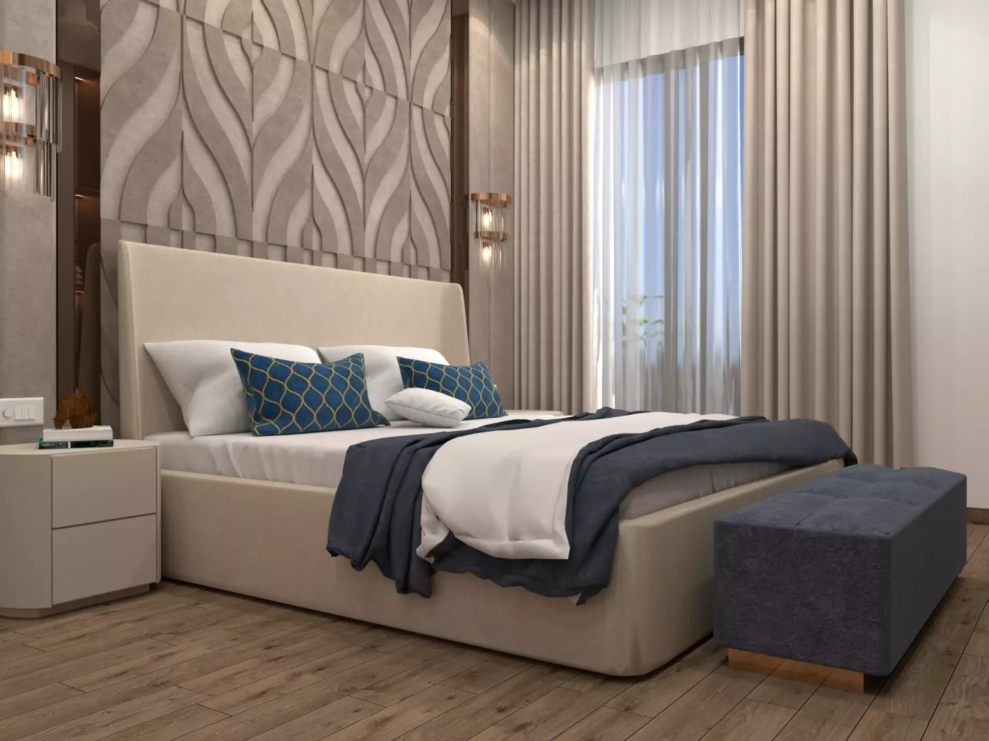 In model: King-size upholstered bed, Side tables, wall art, wall lamp, Walk-in Wardrobe, wall panel, Lounge chair, TV Unit.