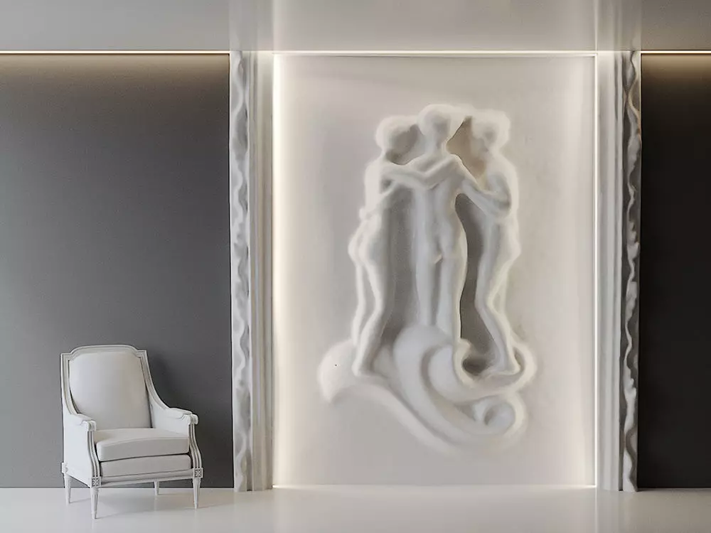 High-poly photo scanned 3D model of a master bedroom large wall gypsum decoration, which provides a customizable and aesthetically pleasing solution for interior design, allowing for a range of artistic expressions and creating a visually striking environment.