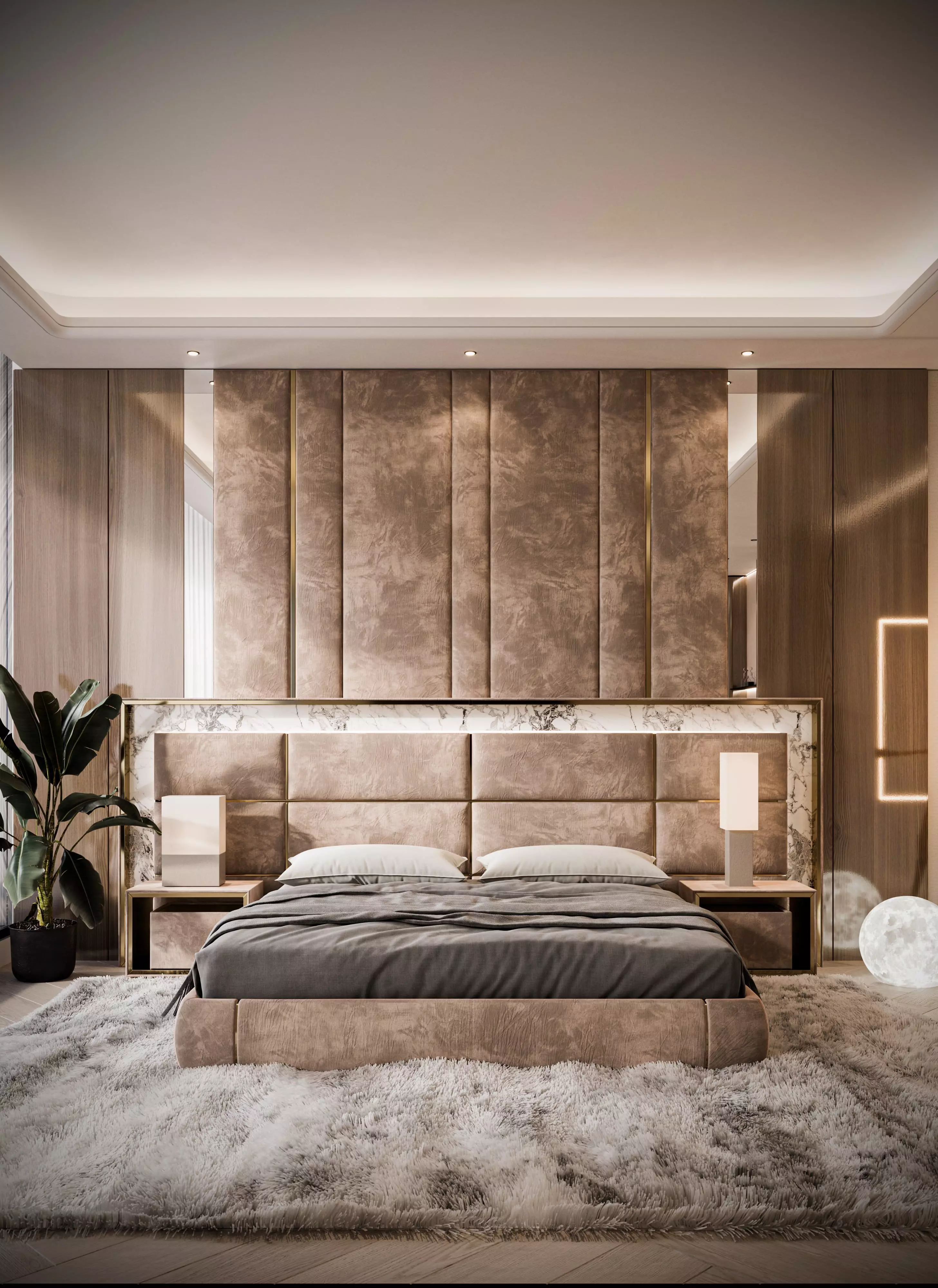 Key Features:Fully Furnished Master Suite: Includes a designer bed setup, nightstands, and an artistic headboard paneling system integrated with ambient lighting.