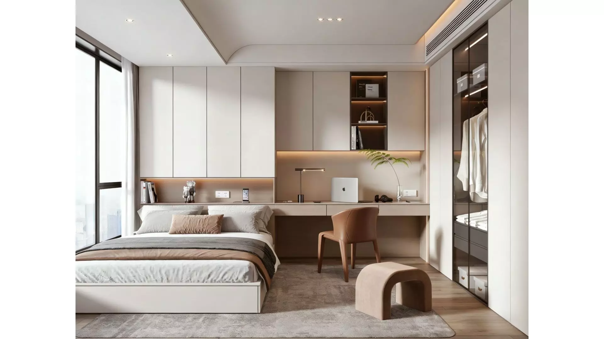 This is a multi-functional bedroom designed around a modern minimalist core, with soft off-white and light wood tones as the main color palette, creating a warm and soothing living atmosphere. The space seamlessly integrates the sleeping area and the office area, and custom wall cabinets and floating suspended ceilings enhance the overall storage capacity and visual neatness.Large floor-to-ceiling windows let in ample natural light, and when paired with a recessed lighting system, they add more layers to the space. Delicate details such as the glass-door wardrobe and curved low stool not only ensure functional practicality but also bring a touch of light luxury texture, making it an ideal urban residence that combines comfortable living with efficient working.