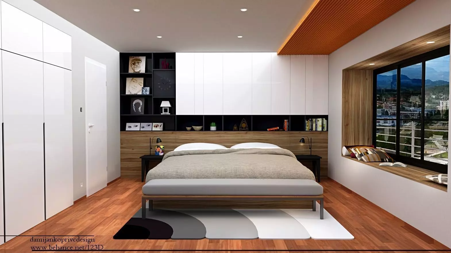 Modern designed bedroom 3d model with reading corner.Unique designed,modern,highly detailed model with lot of useful 3D models in it.Also feature a paintings from my friend. Unique feature are wooden parts on ceiling and reading corner with window view .Model is done with sketch up and rendered with v-ray. All textures and furniture equipment are in high resolution,have been checked and are included in scene.Textures are compressed in zip file.Model is easy to manipulate and ready to render with v-ray.