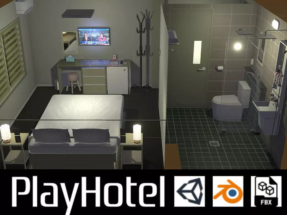 Modeled after a real-life hotel in the seaside town of Sokcho, South Korea. Typical design of a small, modern hotel room in Korea, Japan, or Asia.