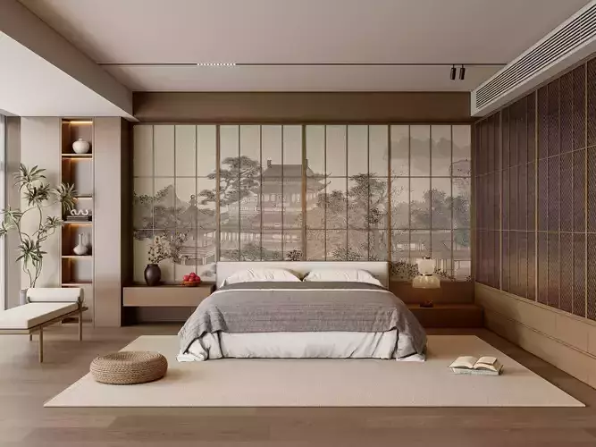 Modern Oriental Bedroom with Wall Art 723 3D model