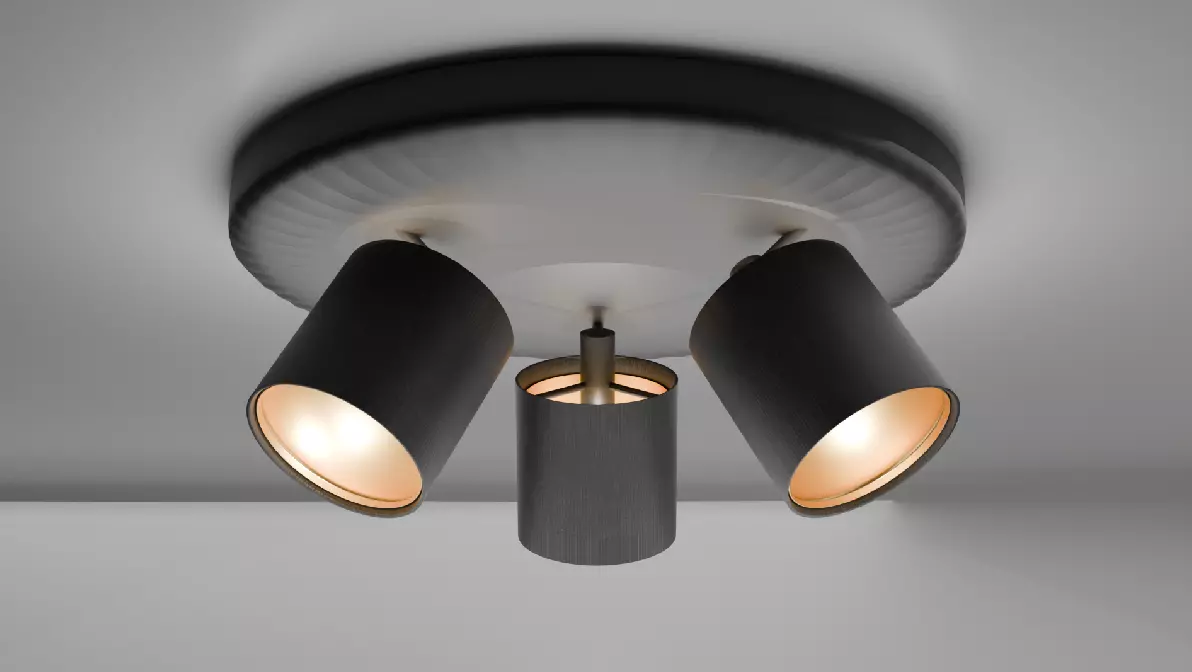 This is a detailed 3D model of a modern ceiling lamp with three cylindrical spotlights. The lamps feature a black fabric texture with a soft inner glow, creating a stylish and realistic design element for any scene. The model is clean, well-structured, and easy to integrate into both architectural visualizations and interior renders. Its simple yet elegant shape makes it versatile for living rooms, bedrooms, offices, or modern commercial spaces. With optimized geometry and realistic materials, this ceiling light adds atmosphere and depth to any project while keeping performance smooth and efficient.