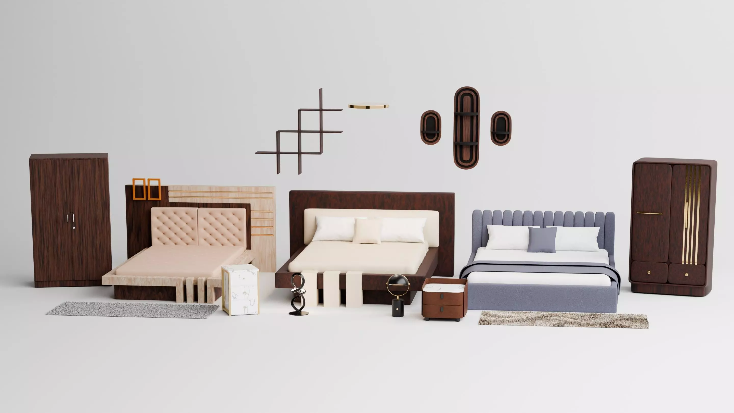 What’s Included:Multiple bed designs (modern + upholstered styles)Nightstands (wood + marble variations)Wardrobes (standard + premium design variants)Decorative lamps & sculptural propsWall shelves & panel decorRugs (different styles & tones)Key Features:Modular system (interchangeable assets)Clean topology & optimized geometryConsistent scale & proportionsSuitable for Blender, Unreal, Unity & ArchVizEasy to customize materials & layouts Perfect For:Interior visualizationGame environmentsProduct rendersScene prototyping